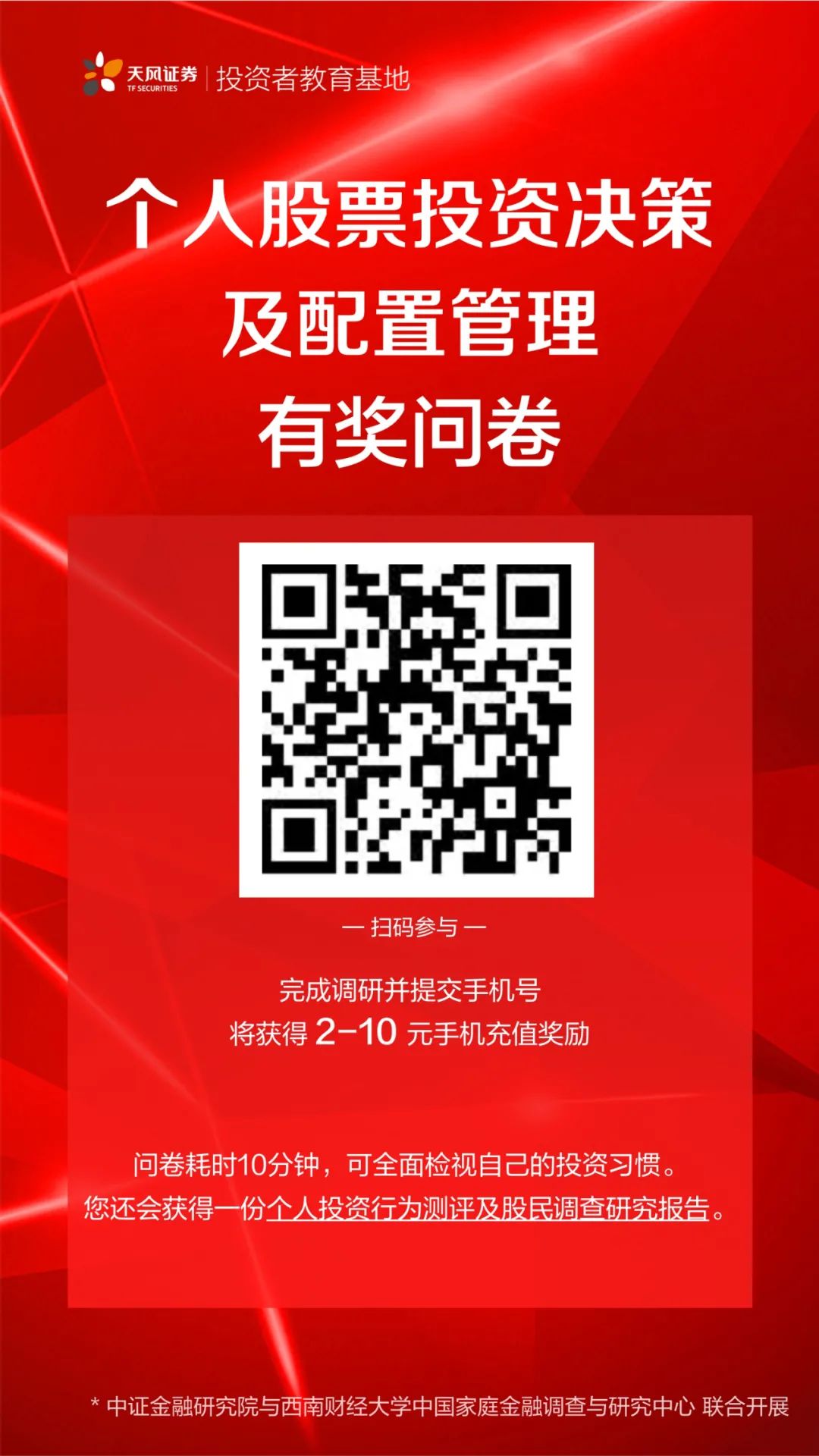 为帮助您更好地了解自身投资过程中的偏好和习惯,进而更加科学地做出投资决策,天风证券投教基地诚邀您参与 “个人股票投资决策及配置管理的有奖问卷”。
