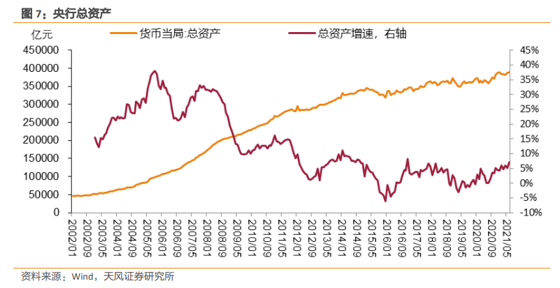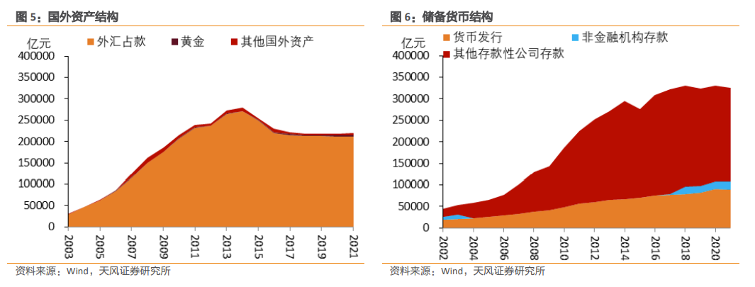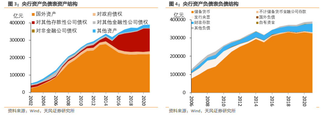 与此同时,与资产端外汇占款不断增长相对应的是负债端储备货币/基础货币,两者分别从资产和负债端推动了央行扩表。