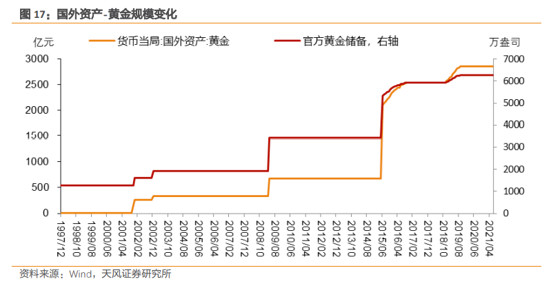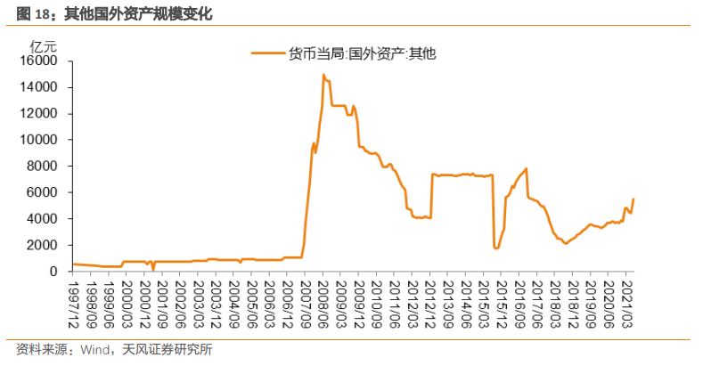 黄金科目记录的是央行从国内或国际黄金市场为购入黄金而投放的人民币数量。其在国外资产科目中占比非常小。黄金规模在2001-2021年间出现的几次跃升,均与央行增持黄金储备的操作相对应。