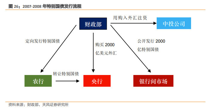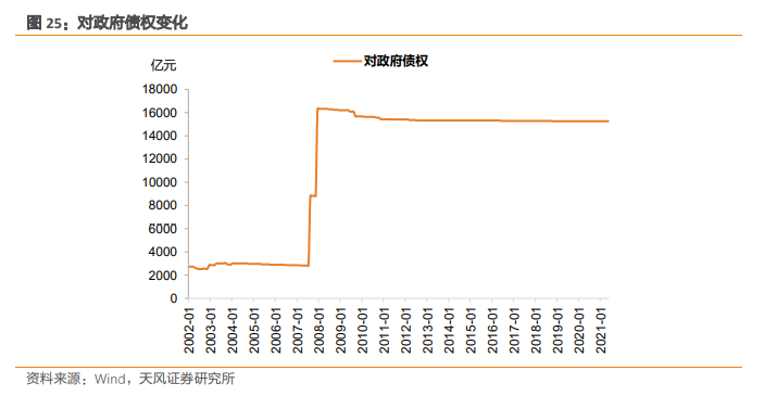 2007年,为了配合财政部购买2000亿美元外汇以作为中投公司资本金,财政部分别于2007年8 月、12 月,向农业银行定向发行6000 亿元、7500 亿元特别国债,然后由央行利用外汇储备购买农业银行持有的特别国债,体现在央行资产负债表上即为2007 年8 月、12 月,对政府债权跳跃式上升(外汇占款科目减少相应金额,不对基础货币产生影响),之后一直稳定在16000 亿元上下。