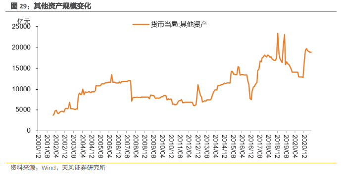 目前央行没有公开其他资产科目下的具体统计内容,但2019年1月份金融统计数据解读吹风会中阮健弘司长曾指出:“央行资产负债表中的“其他资产”,是未单独列示的资产科目集合,主要是一些杂项资产项目和应收暂付项目。年底时,这些项目中有不少会有季节性变动的特点。待年末时点过去后,这些季节性变动会减弱或消除。”