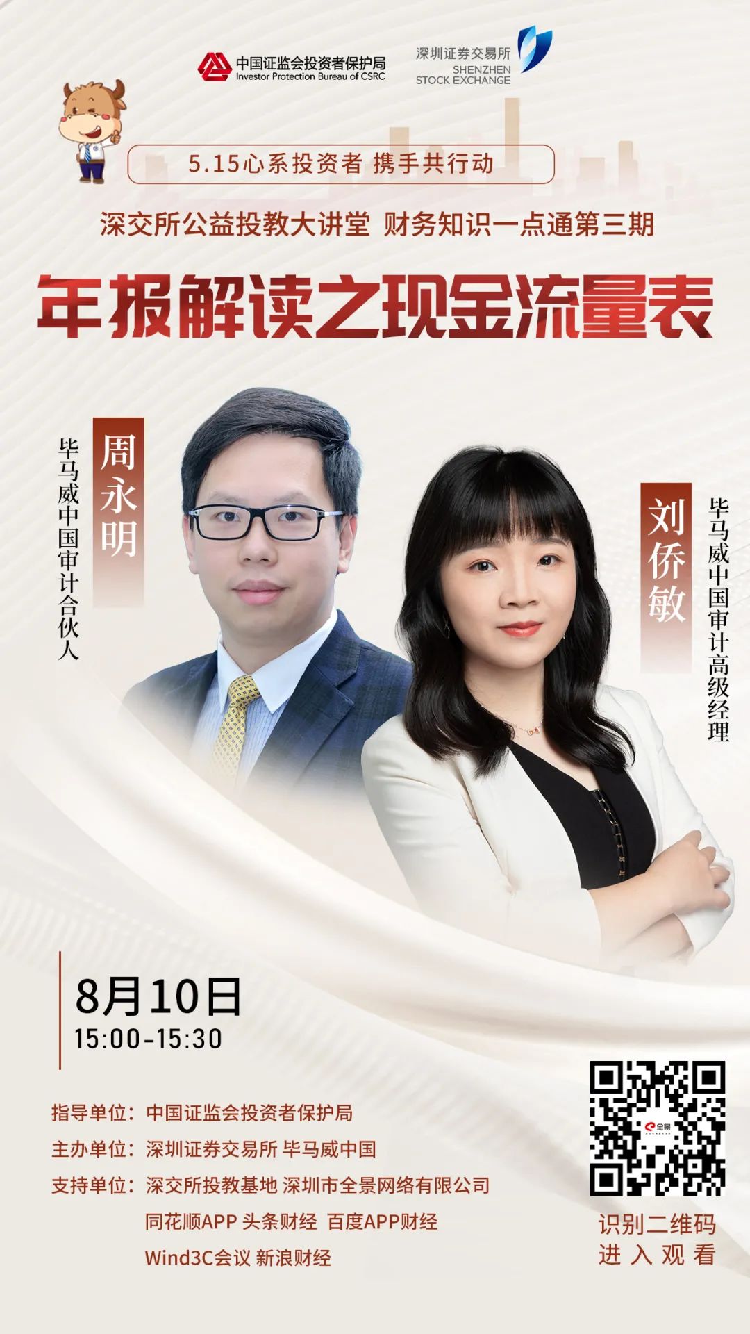 在中国证监会投资者保护局的指导下,深交所推出“财务知识一点通 年报解读”系列视频节目,通过专家讲师深入浅出、化繁为简的讲解,向投资者普及财务会计知识、传递理性投资理念。本期活动邀请毕马威中国审计合伙人周永明、审计高级经理刘侨敏解读上市公司现金流量表,引导投资者看得清、读得懂上市公司财务报表,帮助投资者提升专业知识与金融素养水平。