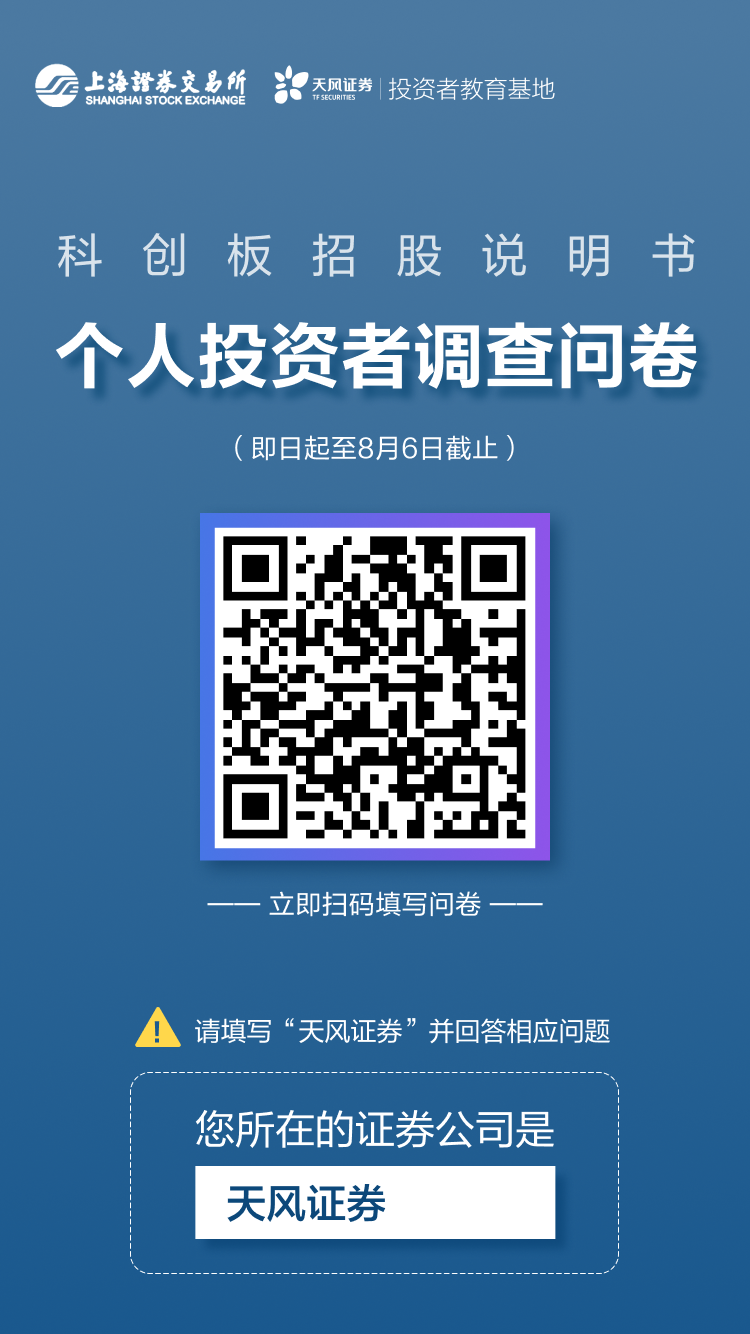 个人投资者阅读科创板招股说明书 专项调查问卷尊敬的投资者:您好!为了解个人投资者阅读科创板招股说明书的习惯和相关需求,以更有针对性地开展投资者服务工作,天风证券投教基地邀请您参与“关于科创板招股说明书的个人投资者调查问卷”。本问卷采用匿名形式,请您首先填写证券账户所属的证券公司(天风证券),根据您的实际情况回答相应问题,您所填写的信息会受到保密。您可通过扫描上方海报二维码或点击“阅读原文”参与填写。感谢您的支持与配合!