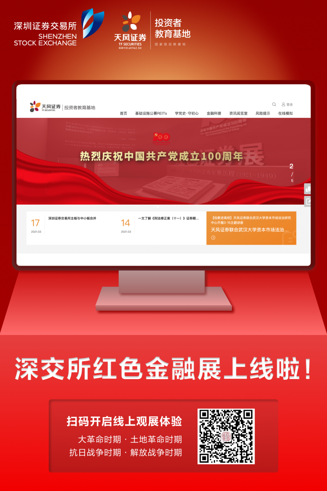 为庆祝中国共产党成立100周年,由中国证监会指导、深圳证券交易所筹办的“红色证券展”网上展览已上线试运行。天风证券以此为契机,用好红色资源,在天风证券投教基地中上线深交所“红色证券展”,方便投资者学习红色金融历史、重温中国共产党的艰辛历程。“红色证券展”线上展览综合运用互联网平台和多媒体技术,全景回顾中国共产党领导下的早期证券发展之路,生动展现1921年至1949年中国共产党党在建立红色政权过程中,创造性运用合作社股票、根据地公债等证券工具筹集资金、发展经济、团结人民、支援革命的艰辛历程。展览分为大革命时期、土地革命时期、抗日战争时期、解放战争时期四个部分,以重要历史节点的代表性事件为主线,展示了我们党将马克思主义基本原理同中国革命实际相结合的伟大实践,填补了国内该领域系统性研究展览的空白。网上展厅以深交所标识“燧石星火”图案为基础设计架构,采用3D建模技术,融入全景体验、实物呈现、图文解说、视频展播等方式,全方位展示近30个历史事件、170余件实物展品。展览特别设置的“自动导览 自行参观”双场景模式,让参观者有身临其境的体验感,是国内同类型网上展厅的首创,其中“自动导览”时长约15分钟,浓缩了展厅精华内容。展览内容详实,展品丰富,整体风格简约庄重,满足了多元化参观学习需求,是党史学习教育的鲜活教材。