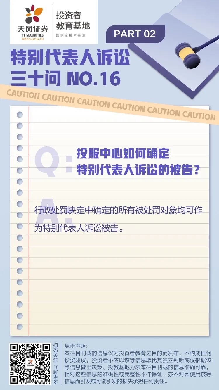 为科普和宣传证券纠纷特别代表人诉讼,天风证券投教基地推出了“特别代表人诉讼三十问”特别专题栏目,将按照投保公司发布的特别代表人诉讼相关概念、知识,每天带您了解一个要点,敬请您关注!