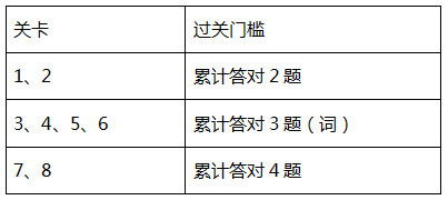 (3)当用户答对的题目数(词数)≥过关门槛则闯关成功。如用户挑战关卡失败,可重新挑战此关卡。过关门槛具体如下: