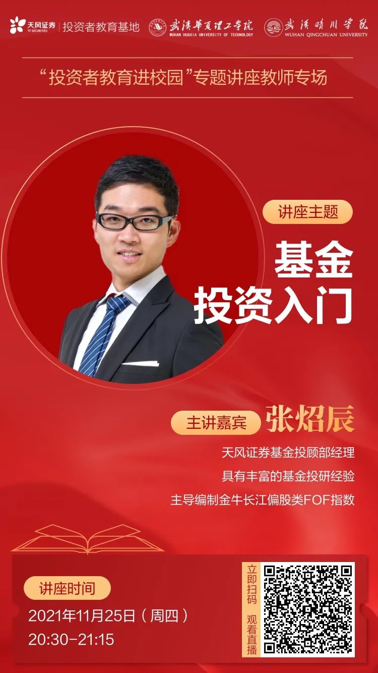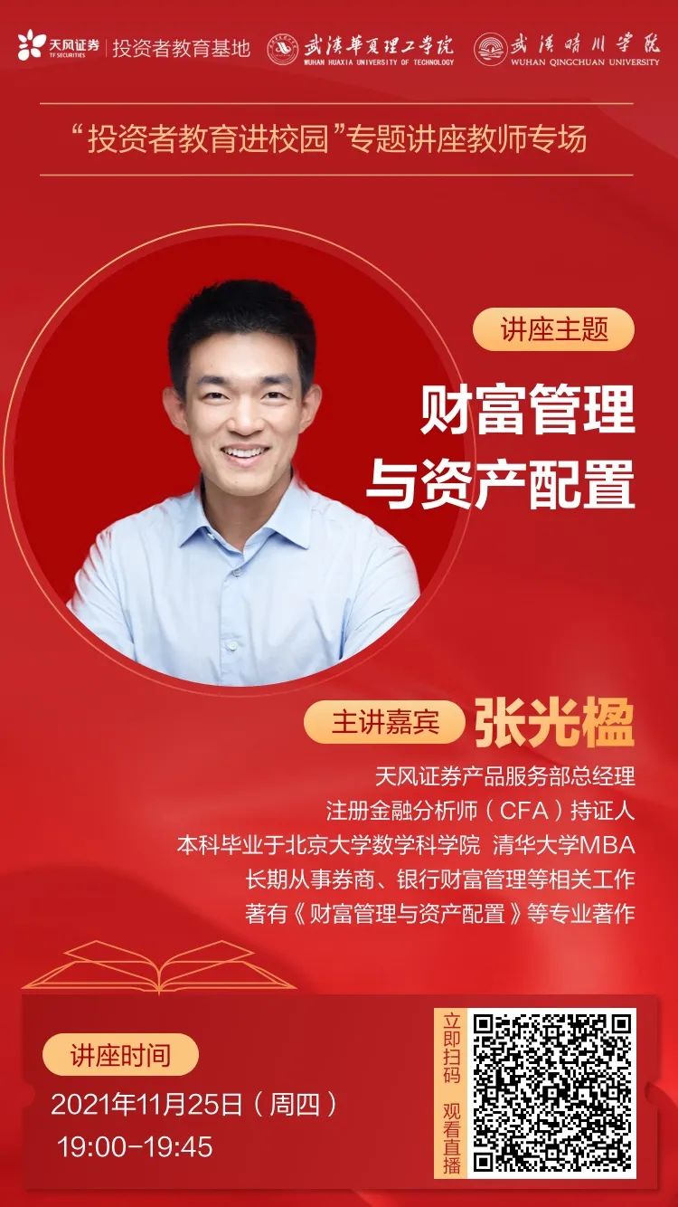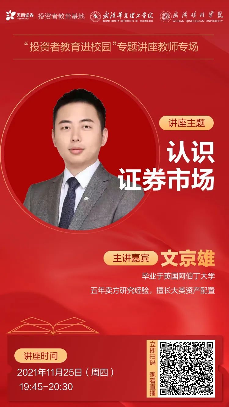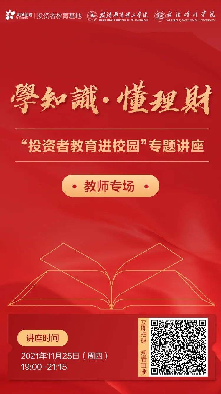 为落实中国证监会与教育部联合印发的《关于加强证券期货知识普及教育的合作备忘录》相关要求,推动投资者教育纳入国民教育体系,在湖北证监局指导下,天风证券投资者教育基地联合武汉华夏理工学院、武汉晴川学院开展面向教职工群体的系列讲座,讲座内容涵盖“财富管理与资产配置”“认识证券市场”“基金投资入门”三个专题讲座,以期在学校范围内培养更多懂金融的师资力量,帮助更多在校师生掌握证券期货基础知识,提升金融素养和风险防范能力。2021年11月25日(周四)19:00-19:452021年11月25日(周四)19:45-20:30