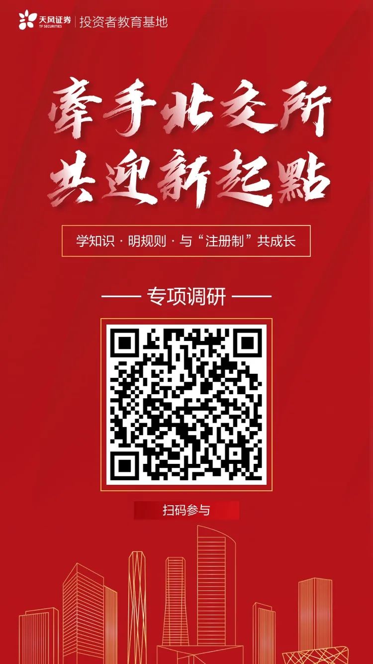 您好!随着北交所的建立和运行,为了解您对北交所的看法和参与意愿,以帮助我们提升服务水平,天风证券投教基地邀请您参与“牵手北交所·共迎新起点”投资者调研问卷。
