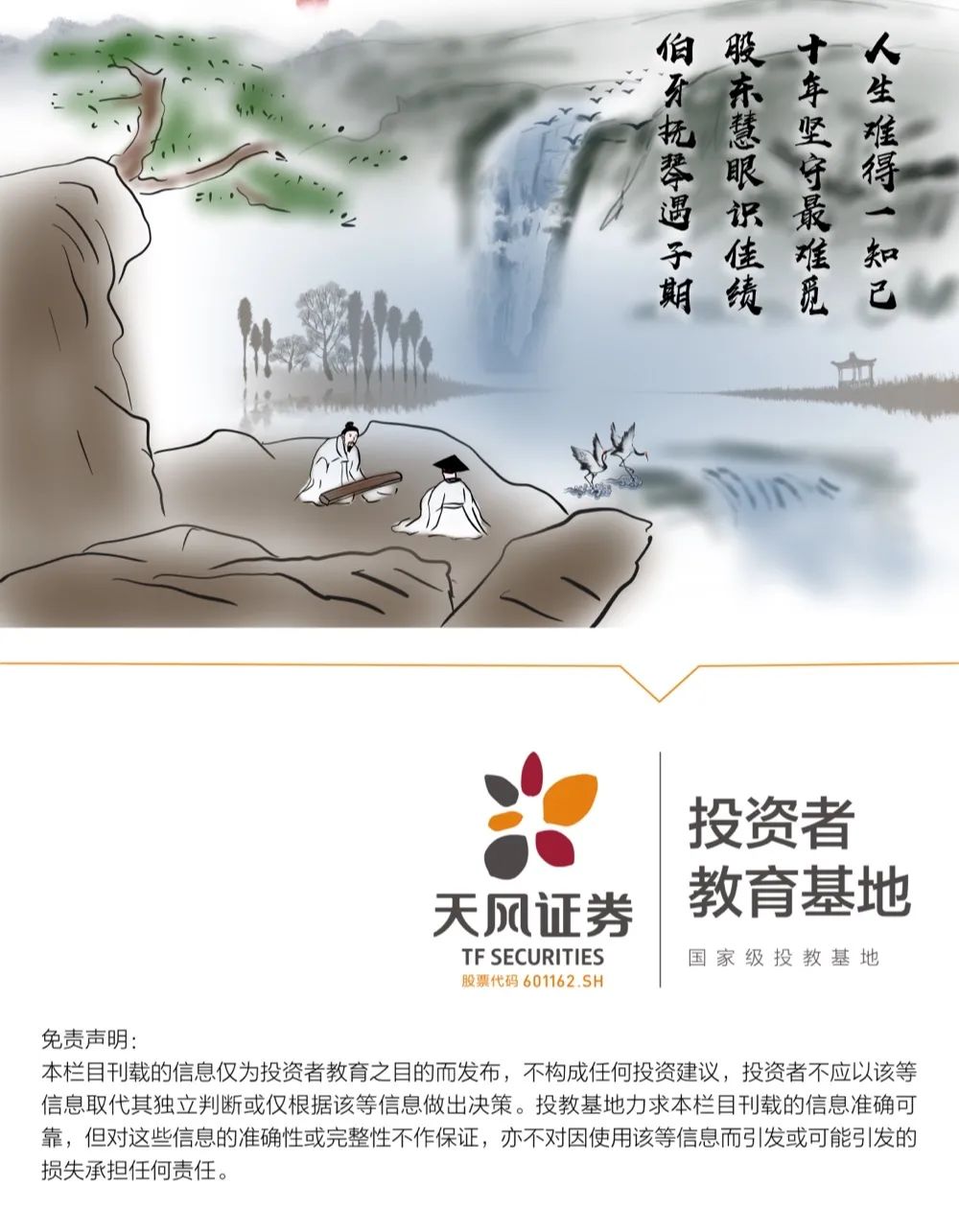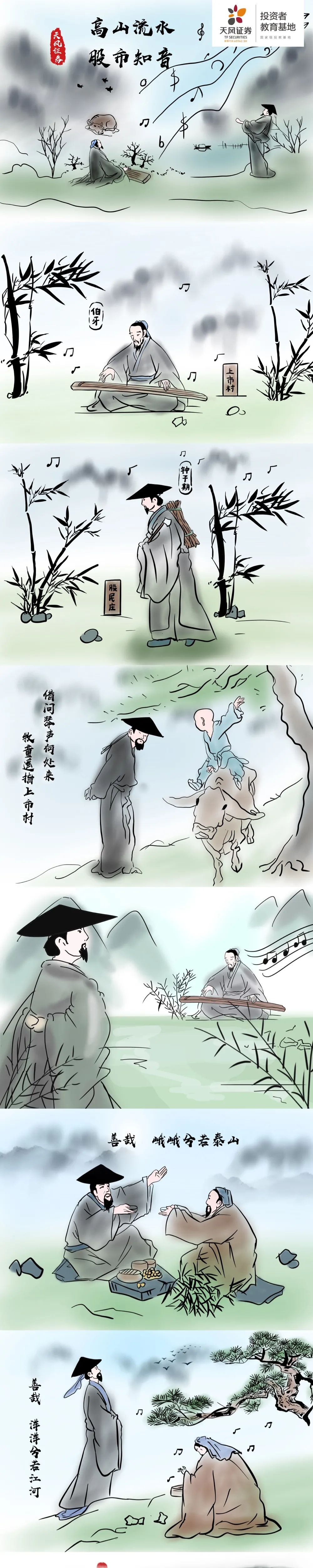 天风证券投资者教育基地制作原创漫画作品 《高山流水,股市知音》 作品欣赏 ↓ ↓ ↓ 漫画背后的故事 伯牙,春秋战国时期晋国的上大夫,原籍是楚国郢都(今湖北荆州)。他是当时著名的琴师,善弹七弦琴,技艺高超。既是弹琴能手,又是作曲家,被人尊为“琴仙”。 钟子期,名徽,字子期。春秋楚国(今湖北汉阳)人。相传钟子期是一个戴斗笠、披蓑衣、背冲担、拿板斧的樵夫。 音乐才子伯牙喜欢弹一曲《高山流水》,却没有人能够听出此曲的感情和意义,他在高山上抚琴,曲高和寡。终于有一天,他遇见了擅长赏析听琴的钟子期,当他弹奏的琴声雄壮高亢的时候,钟子期说:“这琴声,表达了高山的雄伟气势。”当琴声变得清新流畅时,钟子期说:“这后弹的琴声,表达的是无尽的流水。” 该漫画以此故事为背景,把“伯牙子期觅知音"巧妙喻作上市公司与投资者的关系,讲述了来自“上市村”的伯牙与来自“股民庄”子期相遇相知、相惜相守的故事,传递了“强化上市公司与投资者关系管理,构建投资者关系管理发展新格局,促进市场稳定运行和健康发展”的核心理念。