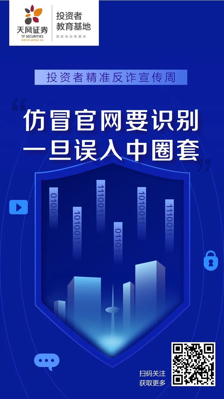 近年来,电信诈骗手段不断翻新,花样层出不穷,受害群体不断扩大,已然成为侵害投资者们财产安全及合法权益的一颗“毒瘤”。天风证券投教基地特别整理出一系列反诈骗tips,提醒投资者们不要上当受骗,注意个人财产安全!