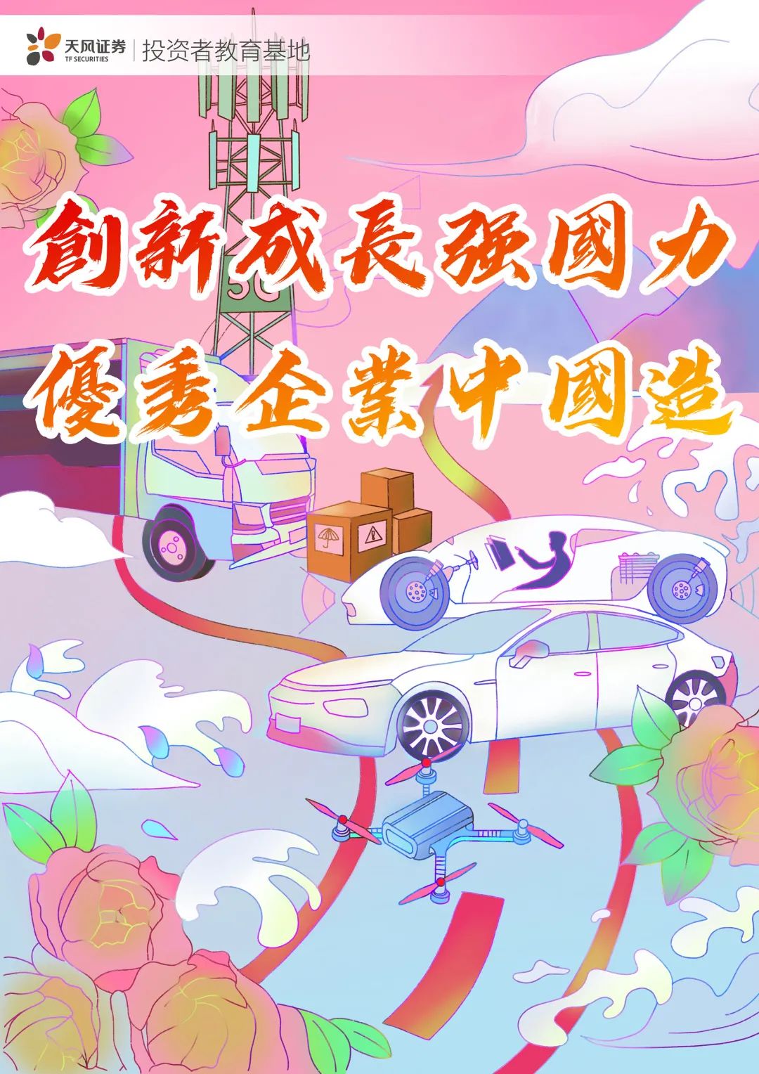 天风证券投资者教育基地制作原创漫画作品 《创新成长强国力,优秀企业中国造》 作品欣赏 ↓ ↓ ↓ 漫画背后的故事 近年来,我国深入实施创新驱动发展战略,鼓励企业积极开展技术创新、业态创新,培养起一批具有国际影响力的创新型企业,不断激发中国经济发展的潜力与活力,为世界经济发展带来更多机遇。 1、动力电池 我国新能源汽车产业快速发展,逐步成长为世界新能源汽车领域的创新高地。作为整个新能源系统原力中枢——动力电池的科技与产能主导者之一,它的全球性交付能力,引领着整个产业脉络的进度,在中国新能源军团中尚无人能望其项背。从“互联网 ”到数字智能化、5G赋能,宁德时代以可靠且安全,高能量密度、超快充技术和超长寿命技术领跑全球。 2、智慧物流 作为国内领先的综合物流服务商,它不仅提供配送端的高质量物流服务,还在人工智能、大数据、机器人、物联网、物流地图等科技前沿领域进行了前瞻性的布局,助力行业客户产业链升级。它了解每一件物品都倾注着用户的托付和期待。它在乎每一个托付,全心送达每一个期待,成为客户值得信赖的选择。 3、芯片 它深耕射频前端领域十数年,在国内射频前端细分领域具有领先优势,是国内少数对标国际领先企业的射频器件提供商之一。它的产品主要应用于智能手机等,客户覆盖全球主要安卓手机厂商,同时还可应用于通信基站、汽车电子、无人飞机、蓝牙耳机等需要无线连接的领域。它高度重视技术创新,作为国内最大射频开关供应商,在射频开关和射频低噪声放大器领域拥有多项核心技术。 4、新能源汽车 随着全球能源加速从化石能源向新能源转型,新能源汽车产业高质量发展也将发挥着越来越重要的作用。“技术创新,值得信赖,引领绿色出行”是它一直以来坚守的品牌价值,坚持大力发展科技节能与新能源汽车,矢志为全社会带来更节能环保、更安全、更便利、更享受的汽车生活,它正在推动全球绿色汽车行业的跨越式发展。 5、智能语音和人工智能 近年来,在国家政策的支持引导下,中国爆发了人工智能创新热潮,成为了世界瞩目的人工智能摇篮。它长期从事语音及语言、自然语言理解、机器学习推理及自主学习等核心技术研究并保持了国际前沿技术水平;积极推动人工智能产品研发和行业应用落地,致力让机器“能听会说,能理解会思考”,用人工智能建设美好世界。