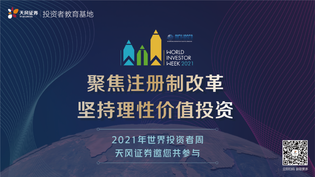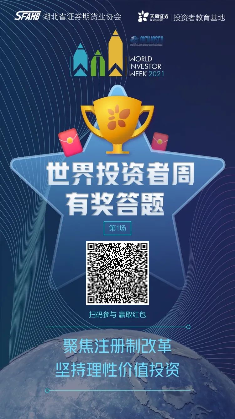 “世界投资者周” 是由国际证监会组织(IOSCO)举办的一项全球性的活动,旨在提升对投资者教育和保护重要性的认识,突显世界范围内证券监管机构关于投资者教育和保护的行动或倡议。为使更广泛的投资者可以从其组织开展的投资者教育和保护工作中获益,IOSCO下设的中小投资者委员会(C8)在2016年悉尼会议上提出举办“世界投资者周”活动的倡议。2021年“世界投资者周”期间,天风证券将围绕注册制改革、可持续金融、防范欺诈和诈骗三个主题开展专项宣传和答题活动,带你学知识、防风险、抽红包! 活动规则 参与答题,根据问题选择正确答案,获得80分以上即获得抽奖资格,有机会赢取最高88.88元的现金红包 参与方式 扫描上方海报中的二维码或点击 “阅读全文”
