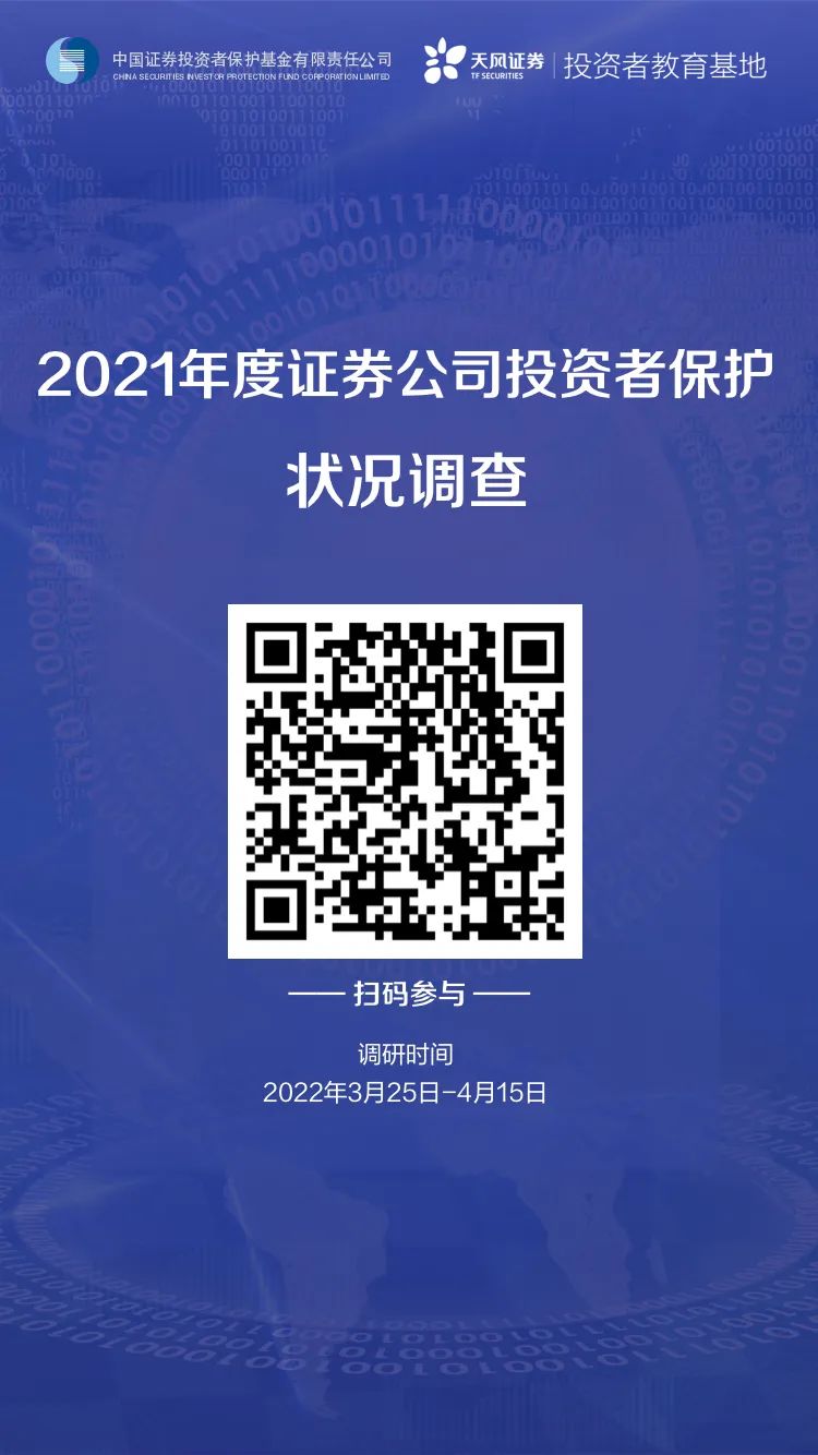 为了解您在投资过程中各项合法权益的受保护状况,天风证券投教基地邀请您参与由投保基金公司组织开展的“2021年度个人投资者状况问卷调查”。