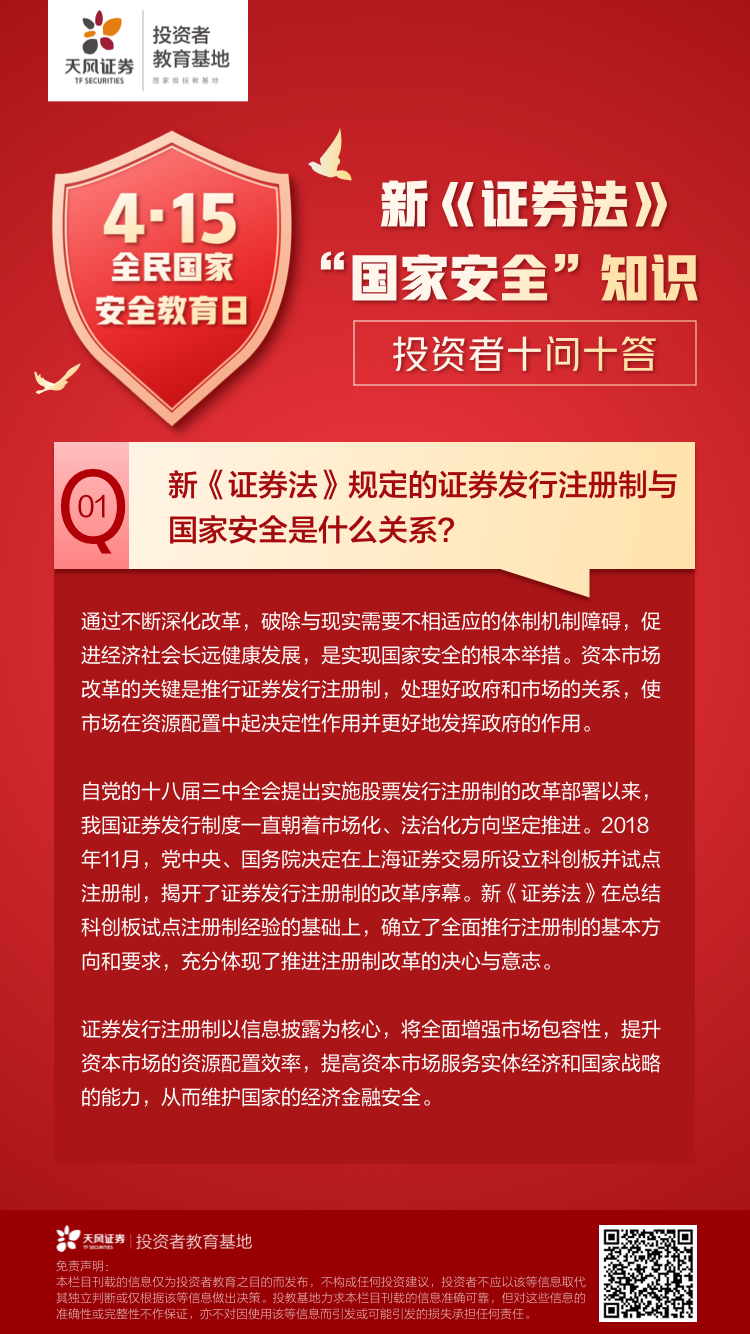 金融是现代经济的“血液”和国家重要的核心竞争力,金融安全是国家安全的重要组成部分。新《证券法》贯彻了总体国家安全观的精神,从全面深化改革、防控市场风险、切实保护投资者权益、提高上市公司质量等多个方面,进一步完善基础性制度,为打造一个规范、透明、开放、有活力、有韧性的资本市场,提供了坚强的法治保障,全面夯实了金融安全的法治根基。为科普和宣传国家安全知识,天风证券投教基地推出了“新《证券法》国家安全知识投资者十问十答”特别专题栏目,敬请您关注!