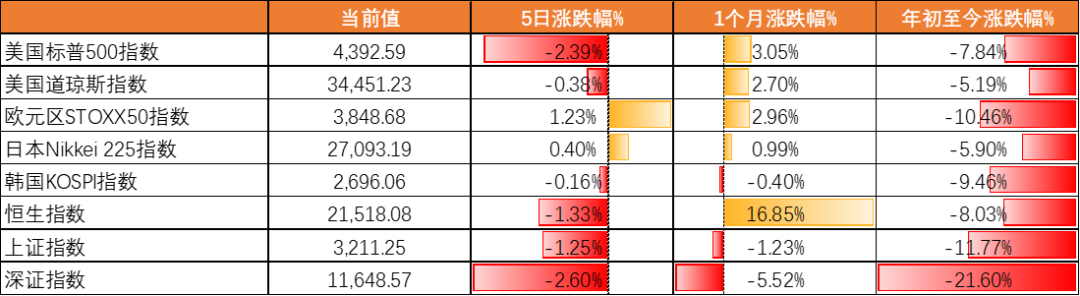 上周全球股市涨跌不一,标普500指数5日跌-2.39%,道琼斯指数跌-0.38%,欧元区STOXX50指数涨1.22%,日经指数涨0.39%,恒生指数跌-1.33%,上证、深证指数分别跌-1.24%、跌-2.60%。