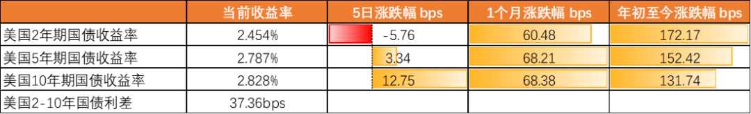 上周美国2年期国债收益率周降5.76bps,5年期收益率按周升3.34bps,10年期收益率按周升12.75bps,2-10年的利差为37.36bps,利差较上周走阔。