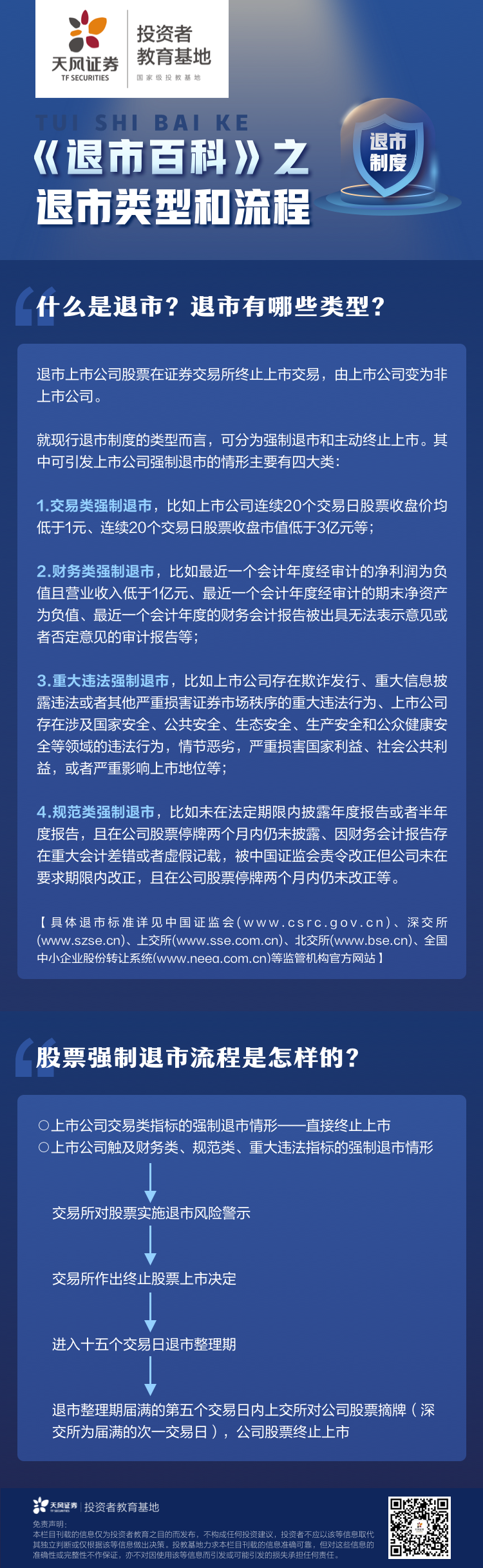 退市制度是资本市场重要基础性制度,深化退市制度改革是加强资本市场基础制度建设的重要环节。随着新《证券法》的实施,“全面实行股票发行注册制,建立常态化退市机制”才能形成有进有出的健康市场。退市制度改革有哪些重要意义?强制退市股票还能上市吗?退市股票如何交易?针对这些问题,天风证券投教基地特别推出“退市百科”系列投教栏目,敬请大家关注!