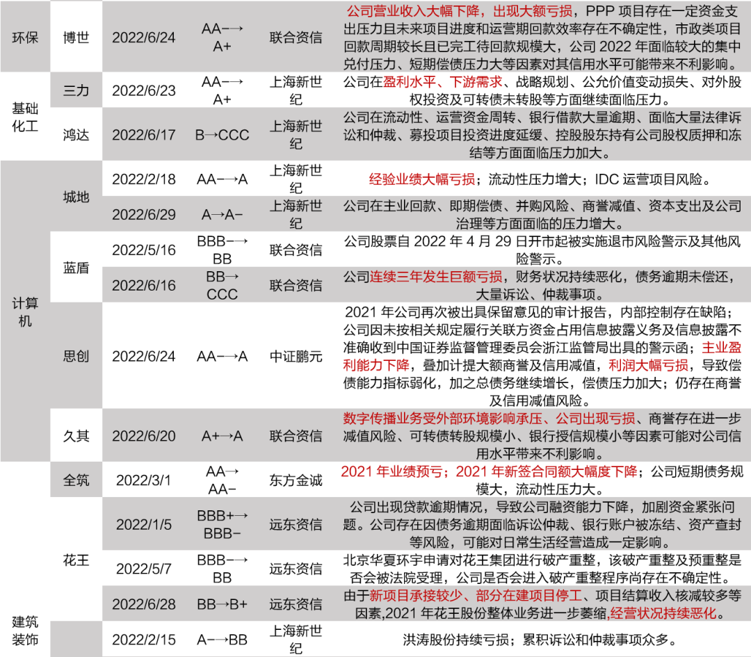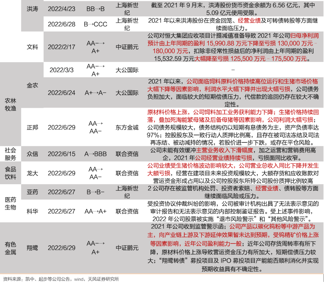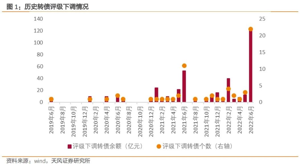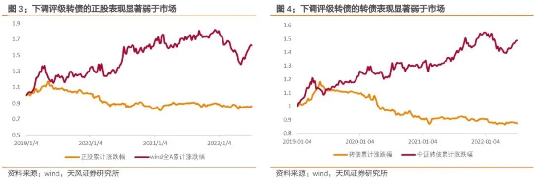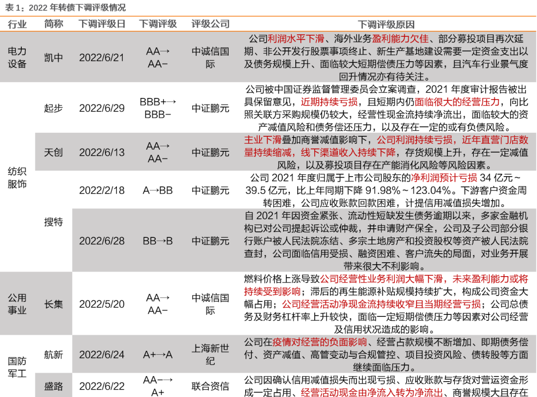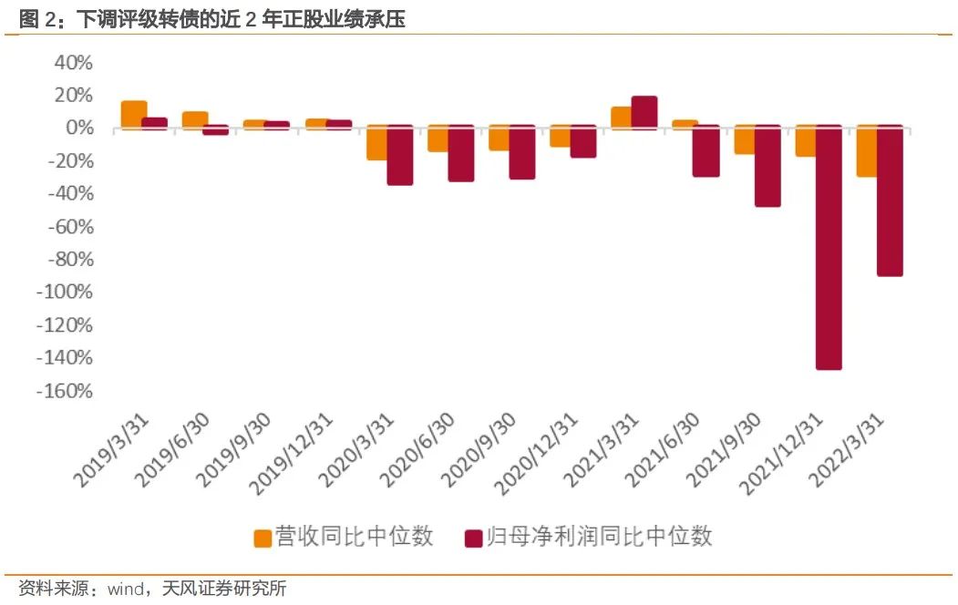 正股业绩显著下滑是主要共性,正股及转债2年前就大幅跑输市场。疫情使得国内企业受到较大冲击、近2年国内对互联网平台、医药生物及房地产等领域政策收紧、全球大宗商品价格上涨推动企业成本上行等多重因素叠加,部分企业的正常生产经营活动受到了较大的影响,进而导致企业业绩显著下滑和影响企业的信用水平。另一方面从市场表现看,由于企业经营显著承压,今年评级下调的25只转债,总体而言其正股及转债表现2年前就显著弱于市场,致使评级下调的因素或已提前反映在价格内。