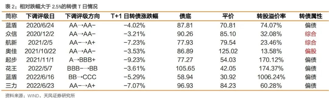 绝对跌幅>2.5%的转债标的共7只(其中蓝盾两次调整跌幅均>2.5%),其中大部分属于高溢价率的偏债型转债。众信、航新、奥佳由于其相对更高的评级,基金持有比例较高,在下调评级后容易形成短期抛压,导致此类转债表现不佳。