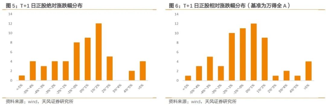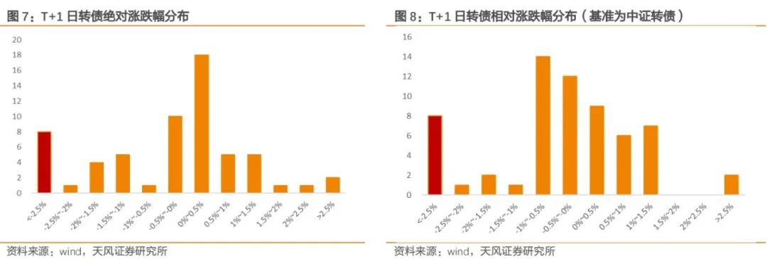 T 1日下调评级转债绝对涨跌幅中位数为0.03%,相对涨跌幅中位数为-0.27%,但跌幅大于2.5%的频次显著高于正态分布,或说明下调评级对部分转债产生了较大的冲击。