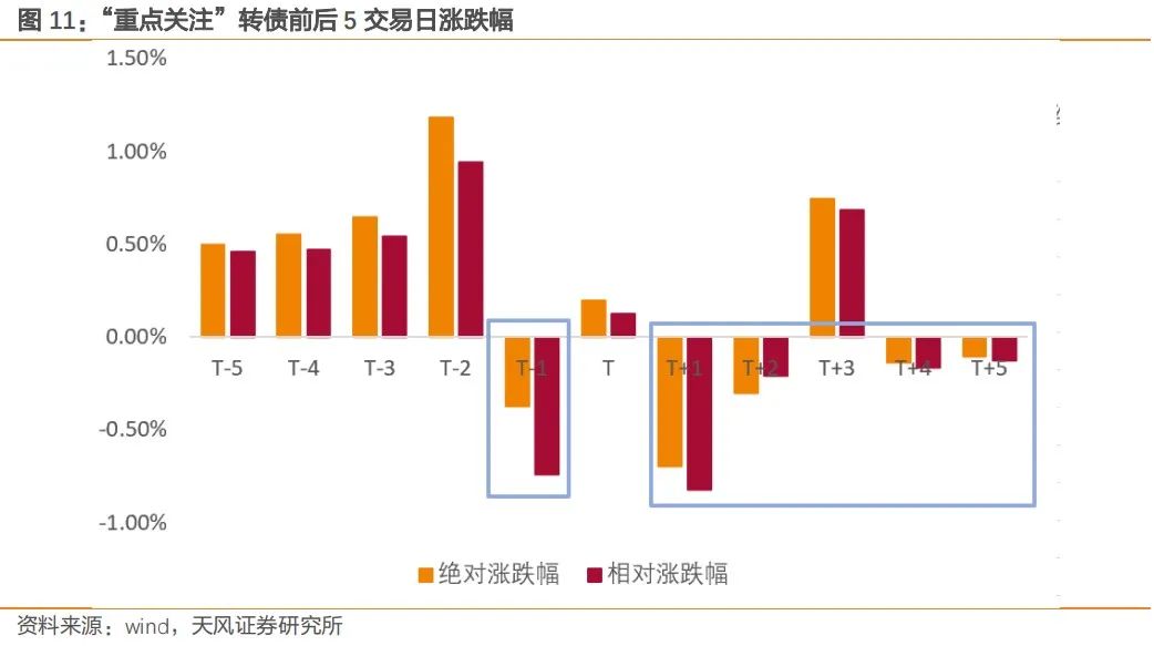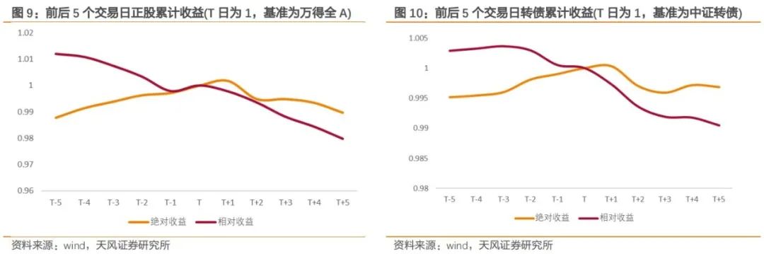 从转债看,T-1日转债相对跌幅异常扩大,且T日后转债明显跑输指数,T 5日相对收益累计下跌约1%。