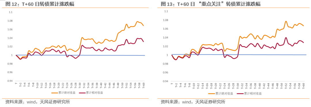 “重点关注”转债最大跌幅更深且回到正收益的时间更长,但与全样本区别不大。全样本累计相对收益在T 6日重回1,期间最大跌幅发生在T 3日为0.94%;而“重点关注”转债累计相对收益在T 9日重回1,期间最大跌幅发生在T 3日为1.04%。