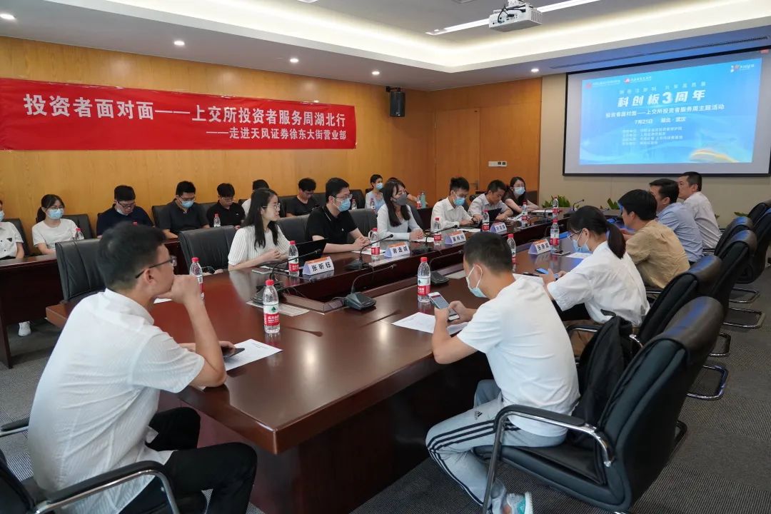 为引导投资者全面认识科创板建设发展成效,切实做好投资者教育、服务和保护工作,7月21日,上海证券交易所走进天风证券徐东大街营业部,开展“投资者面对面——我与科创板共成长”投资者主题座谈会,投资者代表、天风证券徐东大街营业部投顾人员、天风证券投教基地的工作人员等参与了座谈交流。座谈会上,现场投资者代表相继分享了自己的科创板投资经历与感受,也就自己在投资中遇到的困惑和问题,与上交所老师深入交流。来自天风证券的一线投资顾问也就科创板上市公司信息披露、上市审核、科创板指数编制等方面,为科创板市场发展完善建言献策,现场交流气氛热烈。