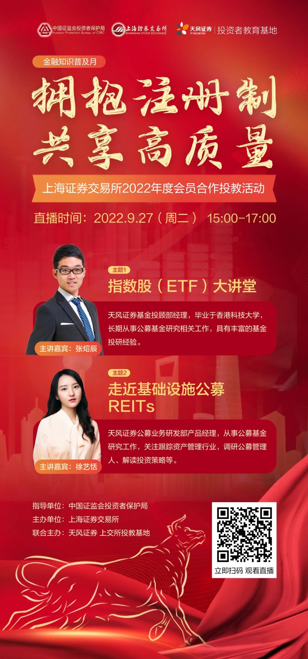 为深入讲述上交所市场高质量发展故事,引导投资者树立理性投资、价值投资理念,上海证券交易所联合天风证券面向投资者举办“拥抱注册制,共享高质量”会员合作投教专题讲座活动。2022年9月27日(周二),将举办第二场直播讲座,欢迎感兴趣的投资者们参与!
