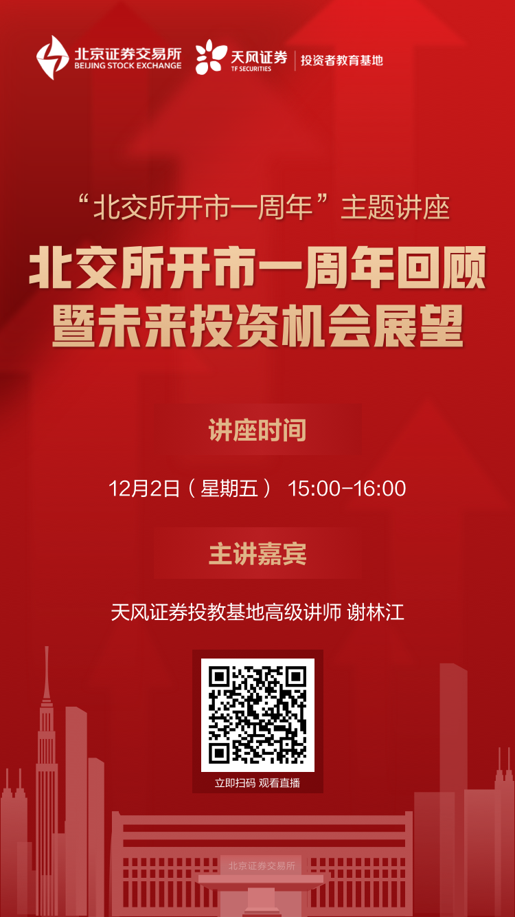 为帮助从业人员更好地掌握北京所相关业务知识,更好地引导投资者关注了解北京证券交易所,理性参与北交所市场投资,营造良好的投资氛围,天风证券联合北京证券交易所共同举办“北交所开市一周年”系列投资者教育活动,敬请投资者们关注!
