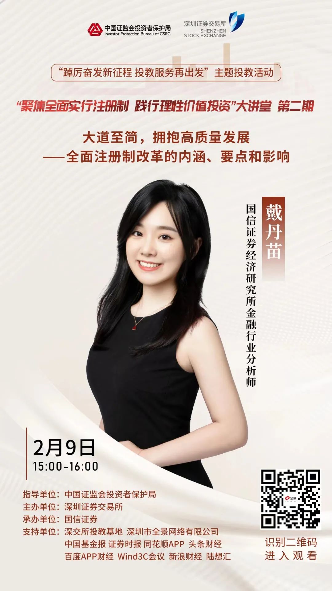 近日,全面实行股票发行注册制改革正式启动,这是贯彻落实党的二十大精神、全面深化资本市场改革的重大举措。深交所将推出“聚焦全面实行注册制 践行理性投资”大讲堂,邀请相关专家详细解读全面实行注册制的重大意义、制度安排以及可能带来的影响,进一步倡导理性投资文化,帮助个人投资者走好全面实行注册制时代理性投资路。今天下午(2月9日)15:00深交所举办“聚焦全面实行注册制 践行理性价值投资”大讲堂第二期,邀请国信证券经济研究所金融行业分析师戴丹苗博士为大家带来《大道至简,拥抱高质量发展——全面注册制改革的内涵、要点和影响》的主题授课。