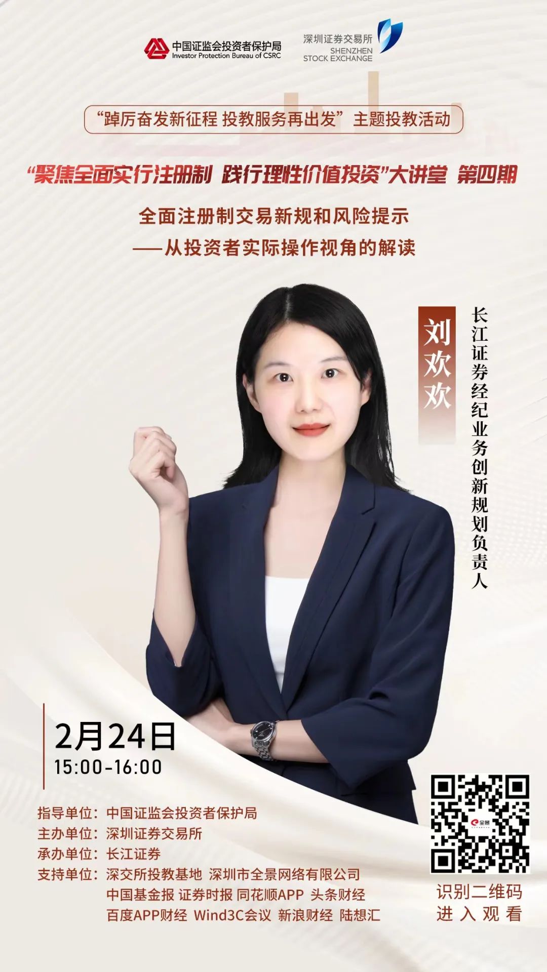 近日,全面实行股票发行注册制改革正式启动,这是贯彻落实党的二十大精神、全面深化资本市场改革的重大举措。深交所将推出“聚焦全面实行注册制 践行理性投资”大讲堂,邀请相关专家详细解读全面实行注册制的重大意义、制度安排以及可能带来的影响,进一步倡导理性投资文化,帮助个人投资者走好全面实行注册制时代理性投资路。今天“聚焦全面实行注册制 践行理性价值投资”大讲堂第四期,邀请长江证券经纪业务创新规划负责人刘欢欢为大家带《全面注册制交易新规和风险提示——从投资者实际操作视角的解读》的主题授课,欢迎各位投资者观看!