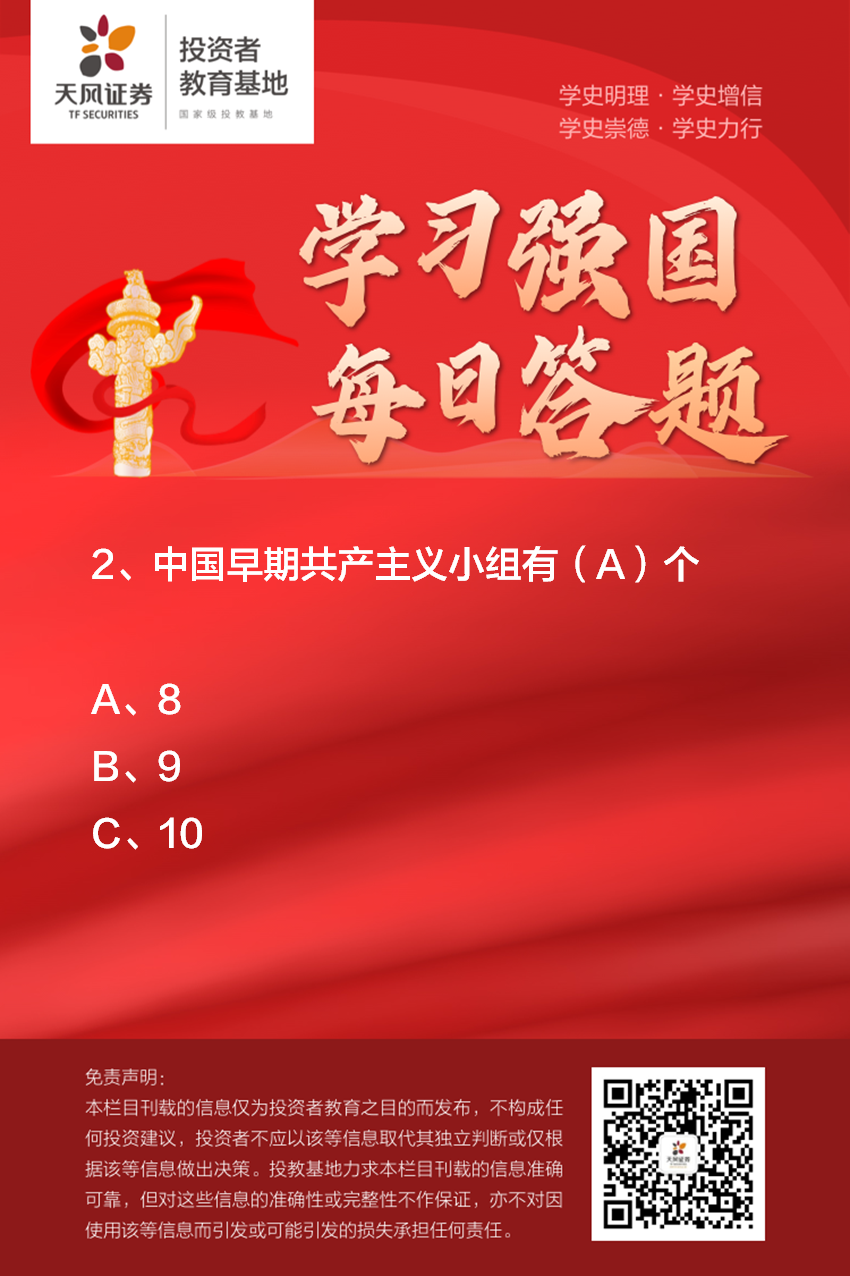 天风证券投教基地特别开展学习强国每日答题互动活动,通过把党史与学习新中国史、改革开放史、社会主义发展史相贯通,引导广大投资者牢固铭记中国共产党百年奋斗的光辉历程,进一步学懂弄通做实习近平新时代中国特色社会主义思想。欢迎各位投资者积极参与!