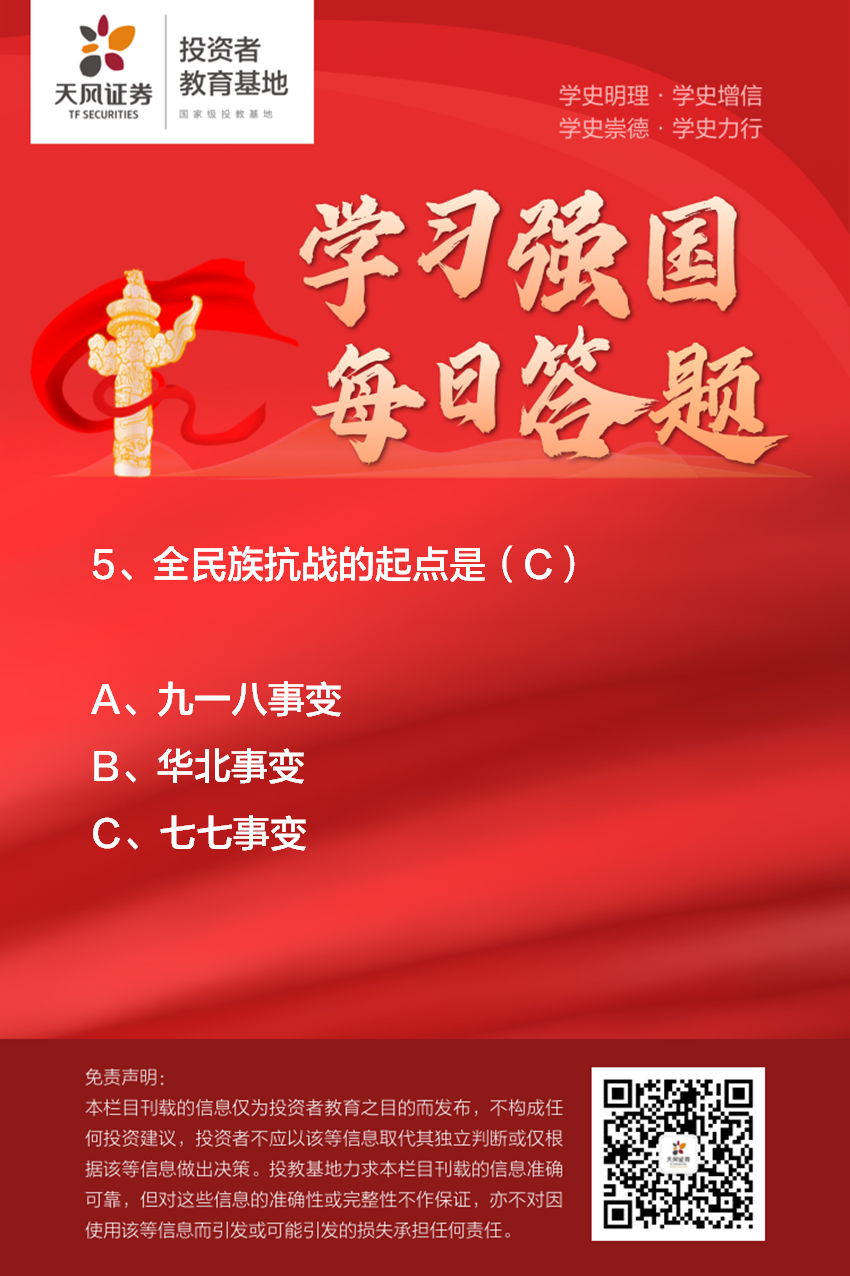 天风证券投教基地特别开展学习强国每日答题互动活动,通过把党史与学习新中国史、改革开放史、社会主义发展史相贯通,引导广大投资者牢固铭记中国共产党百年奋斗的光辉历程,进一步学懂弄通做实习近平新时代中国特色社会主义思想。欢迎各位投资者积极参与!