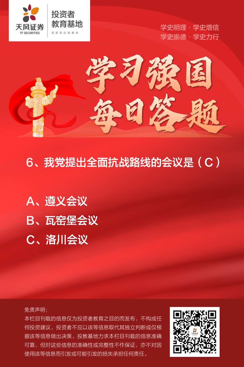 天风证券投教基地特别开展学习强国每日答题互动活动,通过把党史与学习新中国史、改革开放史、社会主义发展史相贯通,引导广大投资者牢固铭记中国共产党百年奋斗的光辉历程,进一步学懂弄通做实习近平新时代中国特色社会主义思想。欢迎各位投资者积极参与!