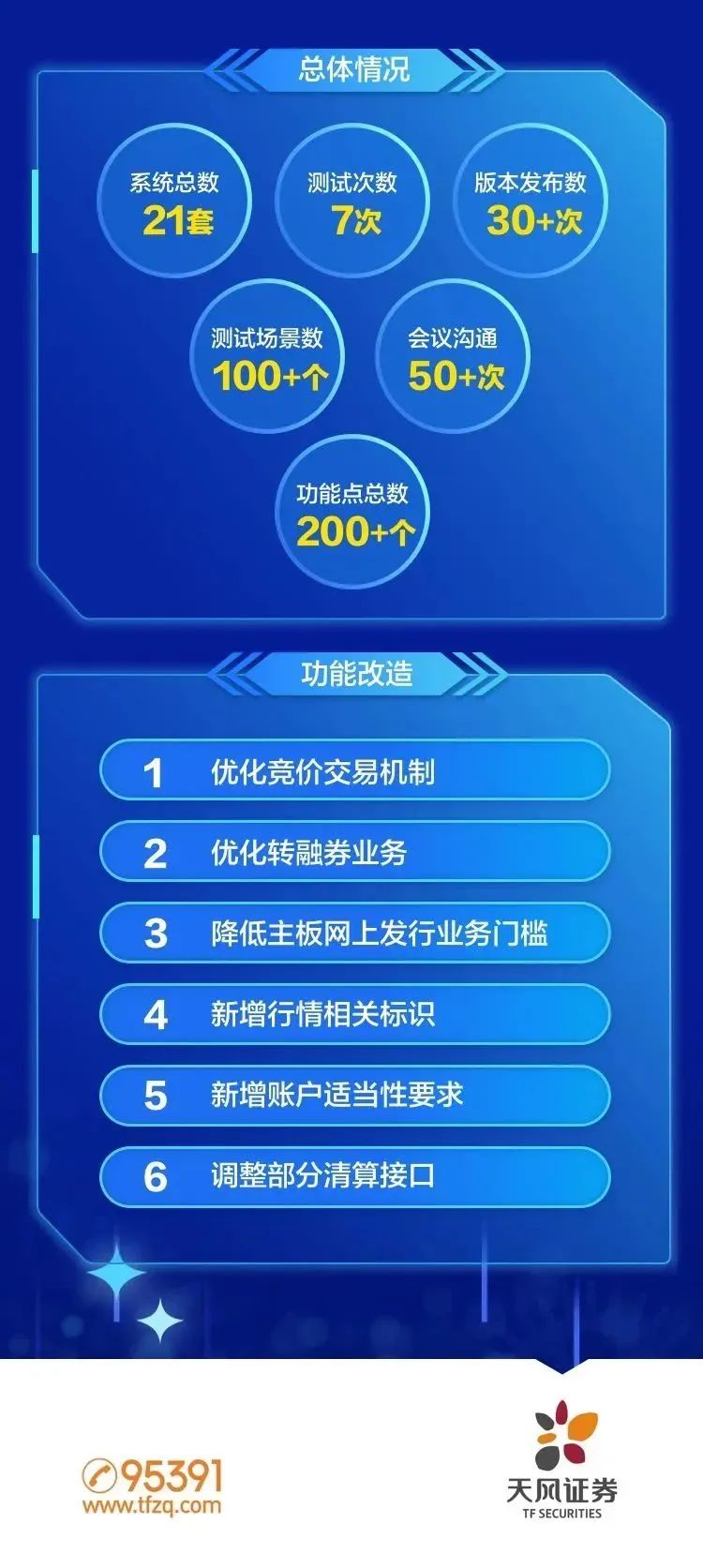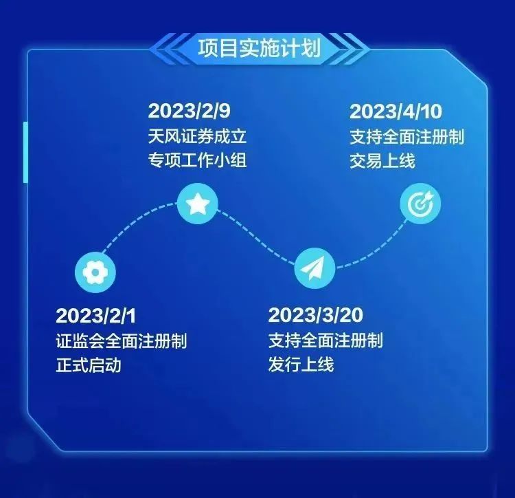 注册制改革 中国资本市场重大里程碑 全面实行股票发行注册制,是暨设立科创板并试点注册制、创业板改造并试点注册制、设立北交所并试点注册制后资本市场又一项全局性的、重大的战略部署,对于健全资本市场基础功能、提高直接融资比重、促进资本市场高发展具有重要的意义,落实好全面实行注册制改革是资本市场重大的政治任务。 2023年2月1日 全面注册制改革正式启动 公司高度重视,2月3日天风证券首席信息官蒋秋伟代表公司参加了中国证监会科技监管局组织的全面股票发行注册制改革行业动员大会,并将会议精神向公司总裁办公会进行了汇报。公司第一时间成立了工作专项小组推进全面注册制相关系统的升级改造工作。2月9日,公司召开全面注册制改造项目启动会,会议宣布了该项目的背景和重要性,指定由金融科技中心牵头,组织公司财富管理中心、大自营、大资管及中后台部门开展相关系统改造各项准备工作,同时明确了各相关部门的具体工作职责及工作计划,要求各部门全力以赴,以确保按监管要求按时、保质保量完成全面注册制系统改造工作。 2023年4月10日起 天风交易系统平稳运行 注册制改革是一场触及监管底层逻辑的变动、对资本市场影响深远。证监局及公司领导高度重视该项目,也对技术系统改造工作提出了较高要求,明确项目实施期间不允许出现任何技术问题。同时由于该项目实施周期短、系统改造范围广,涉及用户群体众多,除了按要求完成系统技术改造外,项目组成员还必须充分全面进行系统测试,及时了解可能存在的问题和风险点,以确保技术系统顺利完成改造上线。为此在金融科技中心的组织下,工作专项小组按计划有序推进各项工作,并根据交易所要求,在2个月内连续完成交易所联网、摸底、全网、通关等多项测试工作,同时全面覆盖所有业务场景,通过交易所验收。最终公司完成共计21套系统的全面升级改造工作,并于4月10日顺利上线。随着沪深交易所主板注册制首批10家企业上市,自此,公司股票发行注册制改革全面落地。