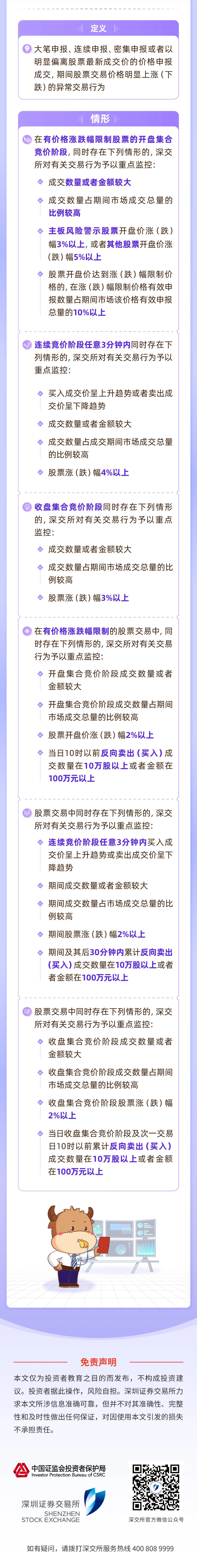 为帮助投资者更好理解全面实行注册制的重要意义和主要内容,深交所投资者服务部特别推出“聚焦全面实行注册制”系列图文解读。本篇介绍深交所主板股票异常交易实时监控细则的规则要点,一起来看看吧!