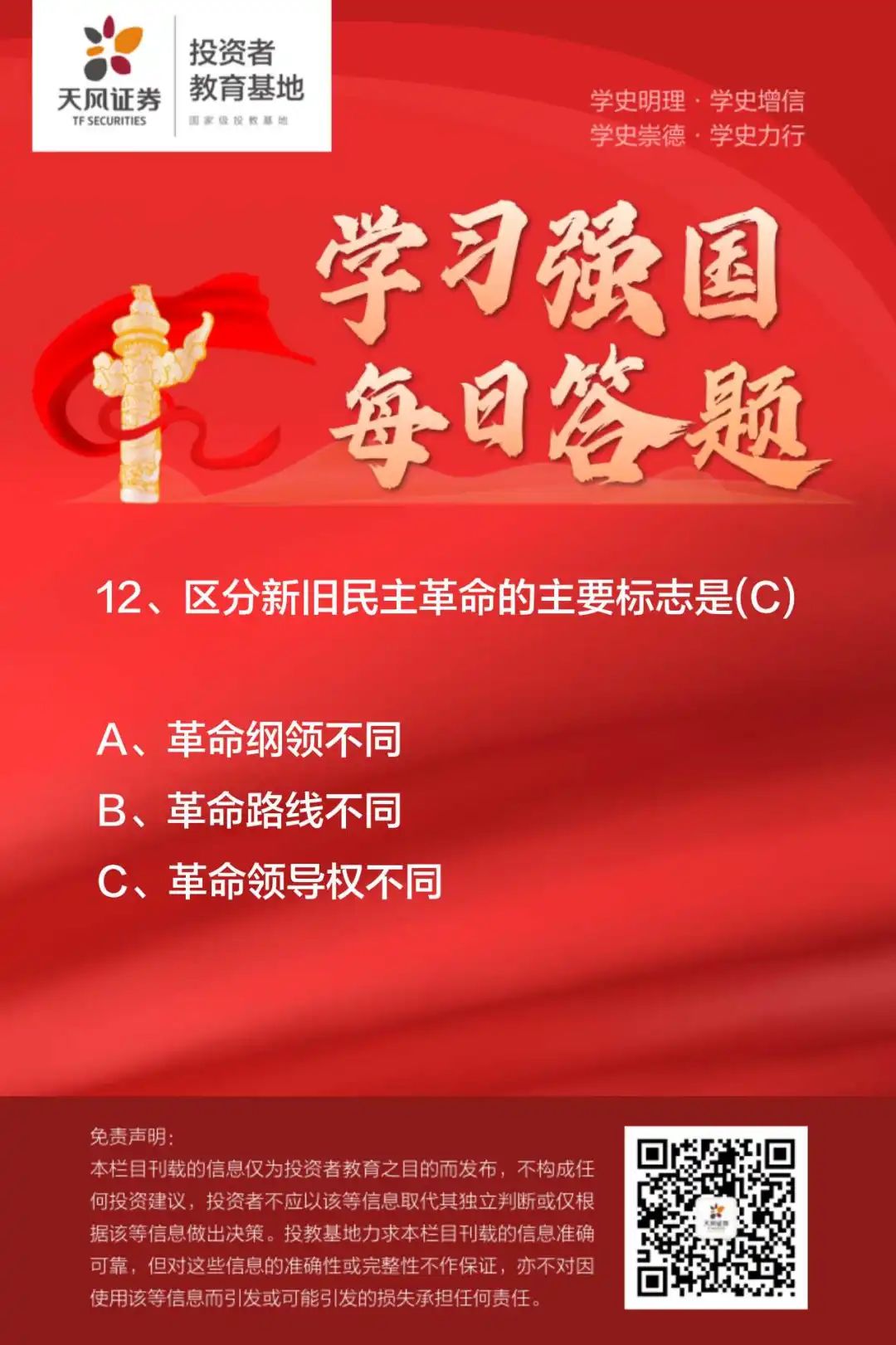 天风证券投教基地特别开展学习强国每日答题互动活动,通过把党史与学习新中国史、改革开放史、社会主义发展史相贯通,引导广大投资者牢固铭记中国共产党百年奋斗的光辉历程,进一步学懂弄通做实习近平新时代中国特色社会主义思想。欢迎各位投资者积极参与!