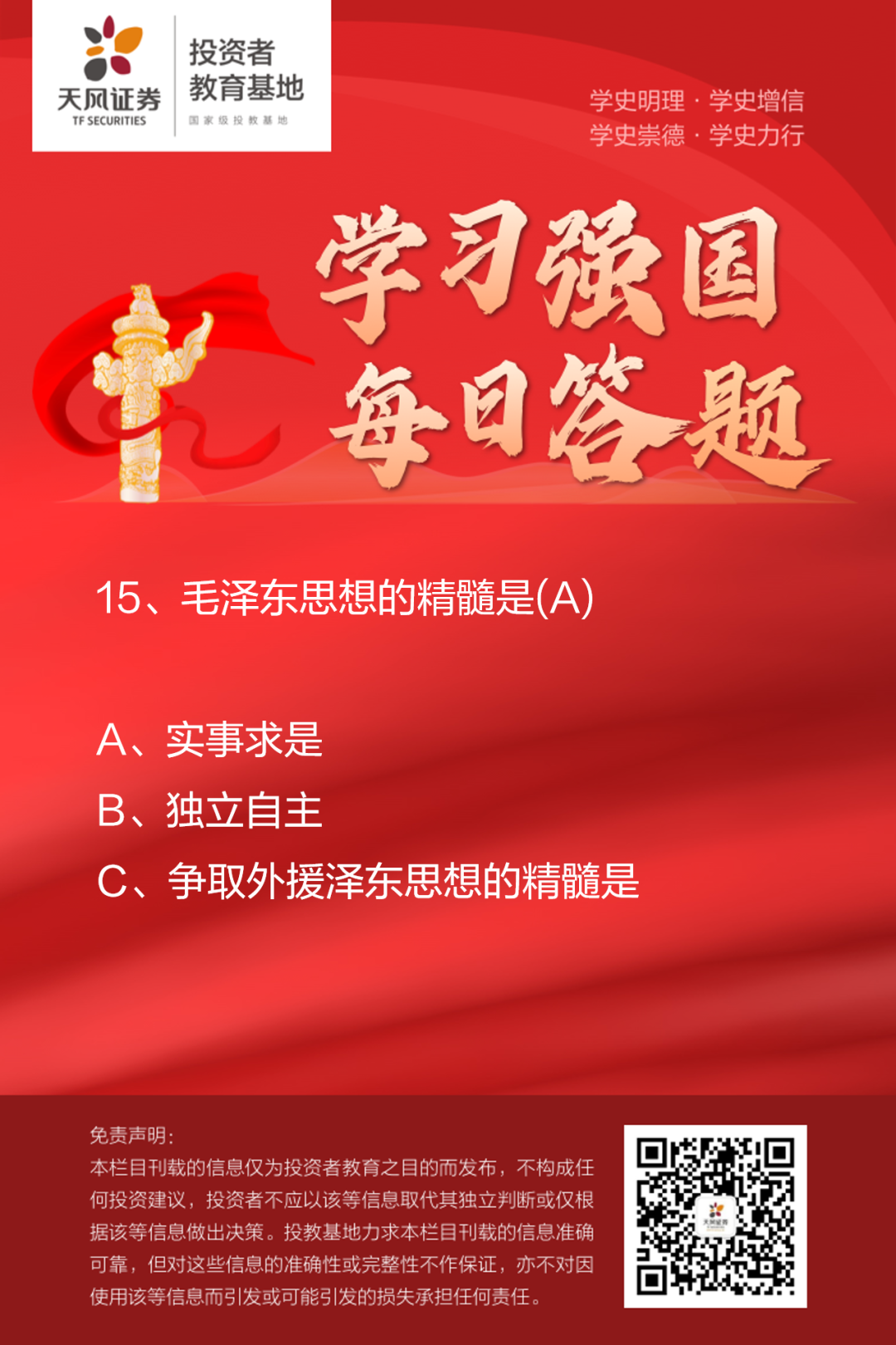 天风证券投教基地特别开展学习强国每日答题互动活动,通过把党史与学习新中国史、改革开放史、社会主义发展史相贯通,引导广大投资者牢固铭记中国共产党百年奋斗的光辉历程,进一步学懂弄通做实习近平新时代中国特色社会主义思想。欢迎各位投资者积极参与!
