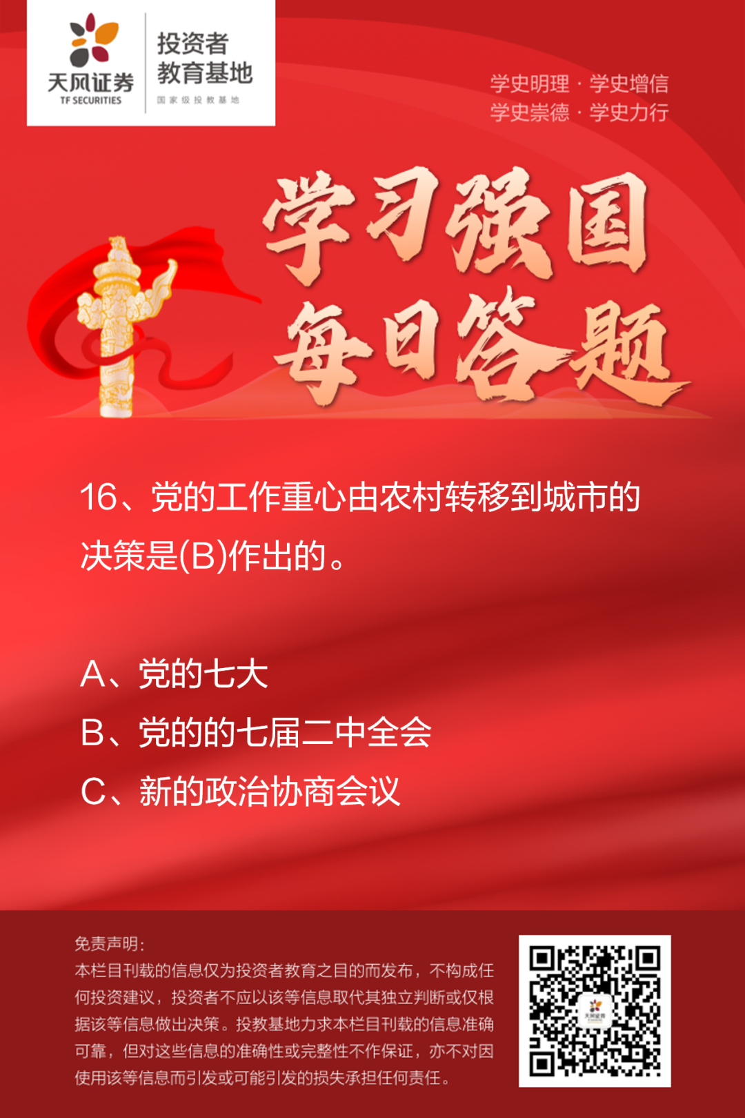 天风证券投教基地特别开展学习强国每日答题互动活动,通过把党史与学习新中国史、改革开放史、社会主义发展史相贯通,引导广大投资者牢固铭记中国共产党百年奋斗的光辉历程,进一步学懂弄通做实习近平新时代中国特色社会主义思想。欢迎各位投资者积极参与!
