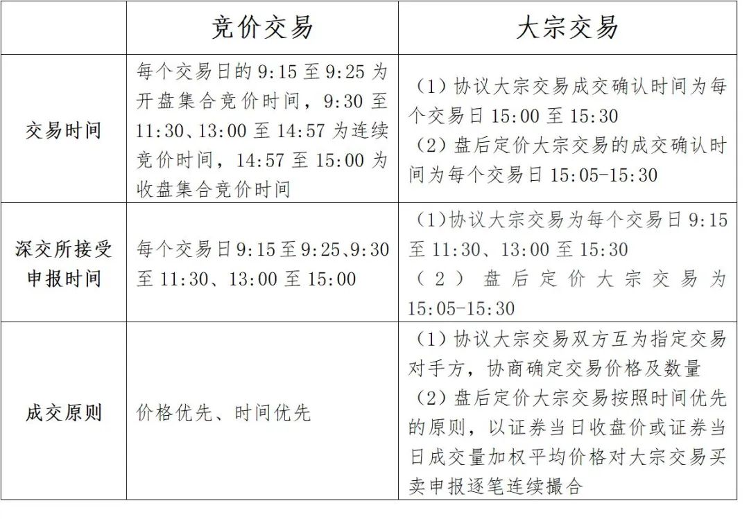 竞价交易和大宗交易在交易时间、申报时间、成交原则等方面存在差异,具体如下: