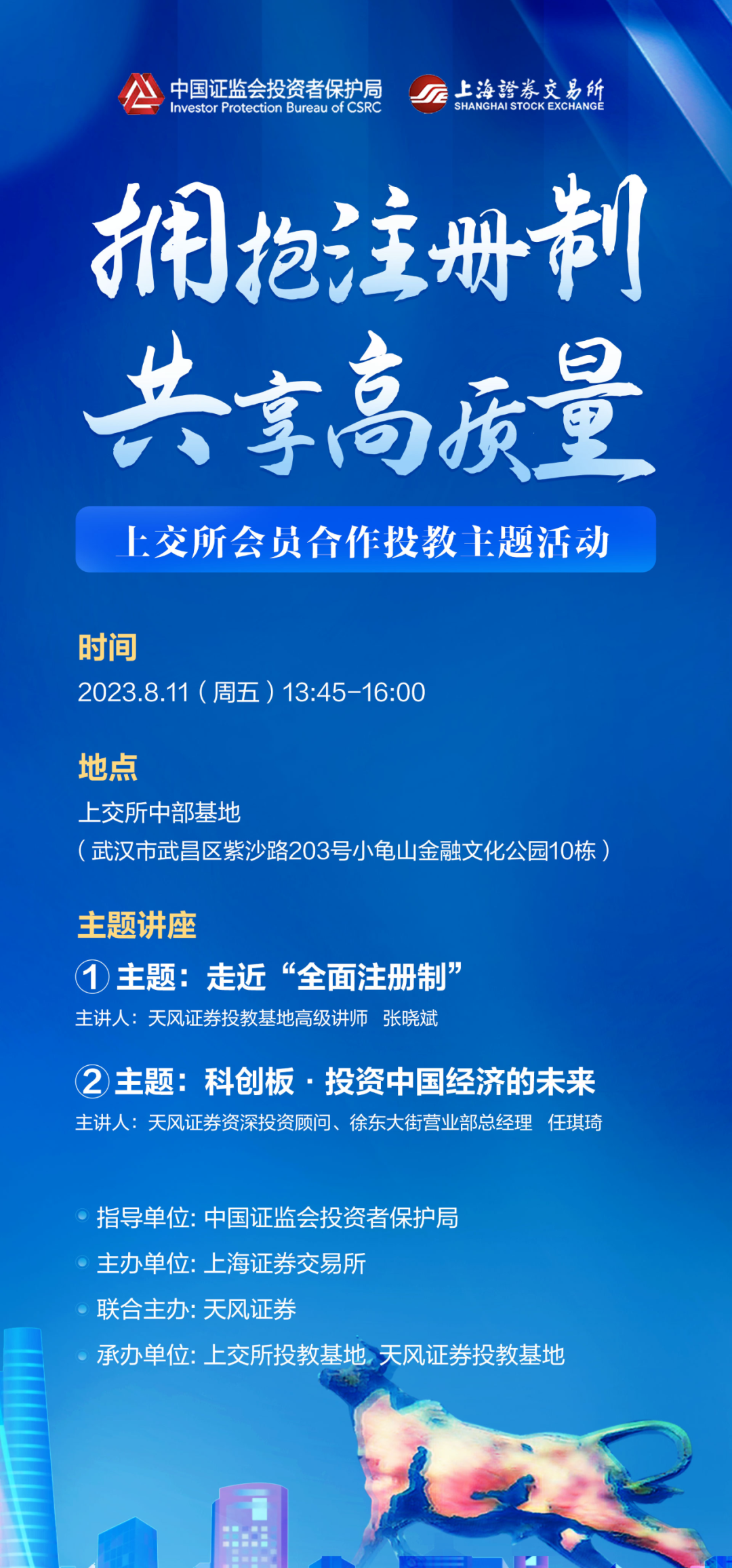 为切实做好全面实行股票发行注册制投资者教育工作,维护广大投资者的合法权益,天风证券携手上海证券交易所,为广大投资者带来“拥抱注册制 共享高质量”主题投教课程。