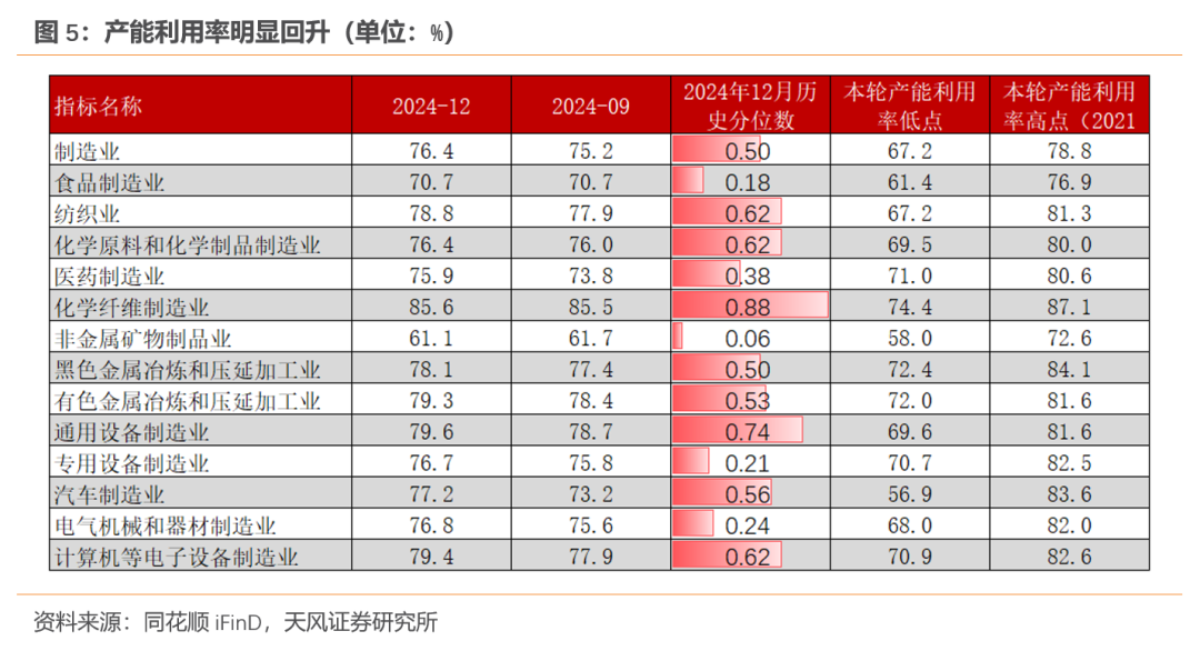 12月服务业生产指数小幅上行0.4个百分点至6.5%,工业增加值同比增速上行0.8个百分点至6.2%,带动估算的第二产业同比增速上行0.7个百分点至5.8%左右,是GDP回升的主因。12月工增季调后环比上行0.6%,高于过去5年均值0.2个百分点。春节错位、抢出口、政策发力等因素是造成12月工业生产环比超季节性的主要原因。短期因素是春节。2025年春节在1月,企业春节前的赶工诉求对12月生产形成了一定支撑。需要注意的是,2025年1-2月工作日仅38天,比2024年1-2月少2个工作日(今年春节假期比往年多一天假期,同时2月又比去年少一天),这对1-2月的工增同比增速或形成一定的压力。中期因素是抢出口与政策发力。出口的份额韧性叠加大选后的“抢出口”带动年末出口进入高增长区间,12月出口同比增长10.7%,出口交货值同比增长8.8%,显著高于6.2%的工业增加值同比增速。在今年关税政策尚未落地之前,出口对生产的支持有望延续。以“两新”政策为核心,政策对生产的拉动主要集中在装备制造业、汽车制造业等直接受益行业。12月通用设备制造业、汽车制造业分别上行3.3、5.7个百分点至7.7%、17.7%。“两新”政策接续,相关行业生产在年初将继续维持高位。随着生产加快,四季度制造业产能利用率小幅上行1.2个百分点至76.4%,其中汽车制造业的四季度产能利用率大幅上行4个百分点至77.2%,显著高于其他行业增速。