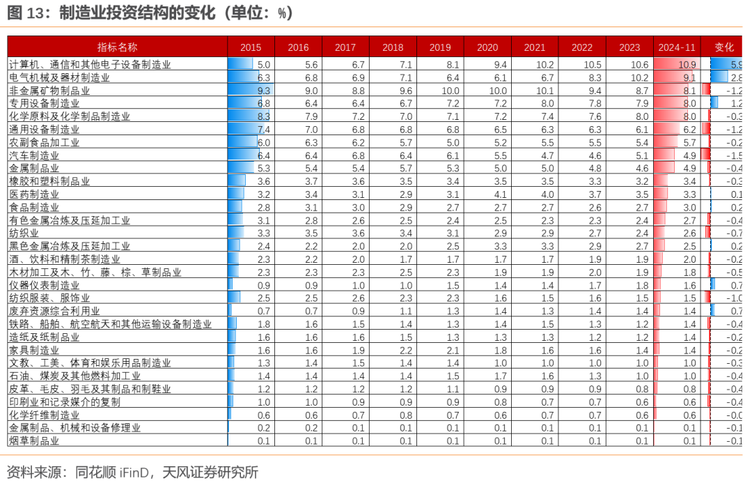 2024年房地产投资同比增长-10.6%,房地产投资连续三年大幅负增长。地产投资占固定资产投资的比重从2021年的27.1%下滑至2024年的19.5%,显著低于制造业和基建占比。随着占比的下滑,地产降幅对固定资产投资、对经济的拖累也在逐渐放缓。在设备更新等政策的带动下,制造业投资近年来持续位于高位,2024年制造业投资同比增长9.2%,其中制造业技改投资比上年增长8%[5]。制造业投资的持续高增长也推动其占比从2021年的32.9%上行至2024年的36.4%,占比明显超过基建和地产。制造业投资分项中,高技术制造业占比稳步提高。2024年1-11月,计算机、通信和其他电子设备制造业、电气机械及器材制造业、专用设备制造业占比相比于2015年分别提高5.9、1.8、1.2个百分点,累计占制造业投资比重的28%,是制造业投资最主要的构成。