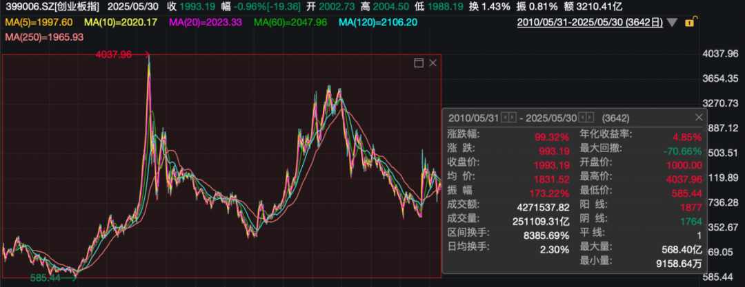 2009年10月30日,创业板首批28家企业成功上市,承载着服务创新使命的创业板扬帆启航。7个月后,深交所于2010年6月1日正式发布创业板指数。 十五年间,创业板指从一只不足100只股票、市值规模不足0.4万亿元的新指数,成长为5.64万亿元市值的市场核心指数。 接下来让我们通过几组数据,一起深入了解创业板指。 牛市里的“上涨先锋” 2010年6月1日,创业板指正式发布。截至2025年5月30日收盘,创业板指累计上涨99.3%。 指数总市值达到5.64万亿元,相较发布之初的0.36万亿元实现超过15倍的增长。 在A股市场里经常流传这么一句话“牛市要买创业板指”。 作为A股最具代表性的成长股指数之一,创业板指是上涨阶段的“上涨先锋”,在牛市阶段,投创业板就能拿到不错的收益,这也是A股投资者指数投资重要启蒙“教育”。 自2010年6月以来,A股共经历了3轮持续时间较长的明显上涨行情。在这3轮行情中,创业板指都有着很好的表现,涨幅明显优于沪深300指数、万得全A指数。 以2012年启动的“大牛市”行情来看,两年半的时间里,创业板指累计涨幅达554.56%,分别是万得全A指数和沪深300指数的2.08倍和3.75倍。 “优创新、高成长”特色优势 优异的市场表现背后,作为表征中国创新创业企业发展的代表性指数,其“优创新、高成长”特色优势是指数备受市场青睐的重要原因。 创业板指由创业板中市值大、流动性好的100只股票构成。开板至今,这一指数见证了创业板市场的蓬勃发展历程。综合2024年年报及2025年一季报情况来看,样本公司实现了营收利润双增长,“优创新、高成长”特色优势进一步显现。 2024年,创业板指样本公司实现营业收入1.7万亿元,净利润约1800亿元,营收、净利润均实现增长。具体来看,近七成样本公司实现营收正增长,近五成样本公司实现净利润正增长,超四成样本公司实现营业收入、净利润同比增长超10%。创业板指总体盈利及造血能力进一步增强,样本公司毛利同比增长12%,现金流同比增长16%。2025年一季度,创业板指业绩增势强劲,营收同比增长9%、净利润同比增长26%。 持续迭代精准匹配市场主题 指数是通过规则筛选成份股的,通过对成份股的定期调整,能够让那些符合国家发展战略、具备优秀成长基因的企业获得更多的市场资源。 15年来,潮起潮落、大浪淘沙,创业板指成份公司历经更迭、“新陈代谢”,样本股累计历经53次调整。这样定期的“吐故纳新”,也让创业板指精准把握不同时代的成长主题。 以2015年的牛市为例,TMT主题是市场资金的重要投资标的,宏观层面上,以互联网为代表的新经济板块崛起。当时,在创业板指覆盖的行业中,计算机、传媒是权重占比最高的两大行业。 当前,按申万行业分类,创业板指前三大权重行业分别为电力设备、医药生物、电子,这些与政策鼓励发展的绿色低碳、生物科学、先进制造等重要方向一一对应。 源源不断的内生动力 科技创新赋能高成长,创业板指以科技创新引领发展。 创业板聚焦“三创四新”企业,上市公司需符合“创新、创造、创意”的大趋势,或者实现传统产业与“新技术、新产业、新业态、新模式”的深度融合。当前,创业板指覆盖了半导体、人工智能、创新药、医疗器械、光伏、锂电池等“含科量”高的行业,充分体现出了创业板聚焦新兴产业发展,以创新驱动为核心竞争力的定位。 2024年年报数据显示,创业板指数样本公司研发投入共计880亿元,同比增长10%,总体研发强度11%,超两成样本公司研发强度超15%,20家样本公司研发投入超过10亿元,主要集中于新能源车、新一代信息技术、生物等产业。 连续攀升的现金红利 相比为人熟知的创新成长“显性”特质,创业板指的高分红则是其优秀内涵。 Wind统计数显示,2015年至2024年,创业板指的现金分红总额从86.91亿元,提升至812.30亿元,增幅达8.35倍;股息支付率由25%提升至45.95%。 持续攀升的现金分红,一方面能够帮助公司优化资本结构,提高资金使用效率,促进市场平稳健康发展;另一方面,也向市场传递公司财务状况良好的信号,有助于增强投资者信心。 超1400亿元的资金跟踪 目前,创业板指已经成为了市场资金长期配置的重要标的。 Wind数据显示,截至2025年5月30日,共有83只以创业板指为跟踪标的/业绩基准的公募指数基金,规模合计超过1400亿元,产品有ETF、ETF联接基金、普通指数基金、指数增强基金等多种类型,为投资者提供了多样化的创业板投资配置工具。其中ETF产品数量达20只,ETF产品规模达1145.41亿元。 国际投资者持续青睐 巴西当地时间5月26日,巴西资管布拉德斯科(Bradesco Asset Management)与华夏基金(China Asset Management)合作的布拉德斯科华夏创业板ETF(B-Index ETF Connect ChinaAMC ChiNext)在巴西交易所成功上市,这是深交所和巴交所ETF互联互通项目下的首只ETF产品。该产品以联接基金的形式投资在深交所上市的“创业板ETF华夏”(交易代码:159957),让巴西投资者能够“一键投资中国”,更加便利地接触到丰富多元且充满活力的中国市场。 此前,跟踪创业板系列指数的相关ETF产品已先后在美国、韩国、新加坡、欧洲等国家或地区上市。 编制方法重要更新 在指数发布的15周年这一重要节点,创业板指的编制方法也迎来了重要的变革。 今年4月,深交所及其子公司深圳证券信息公司公告表示,为进一步优化完善指数编制方法,提升指数可投资性,将修订创业板指数编制方案。