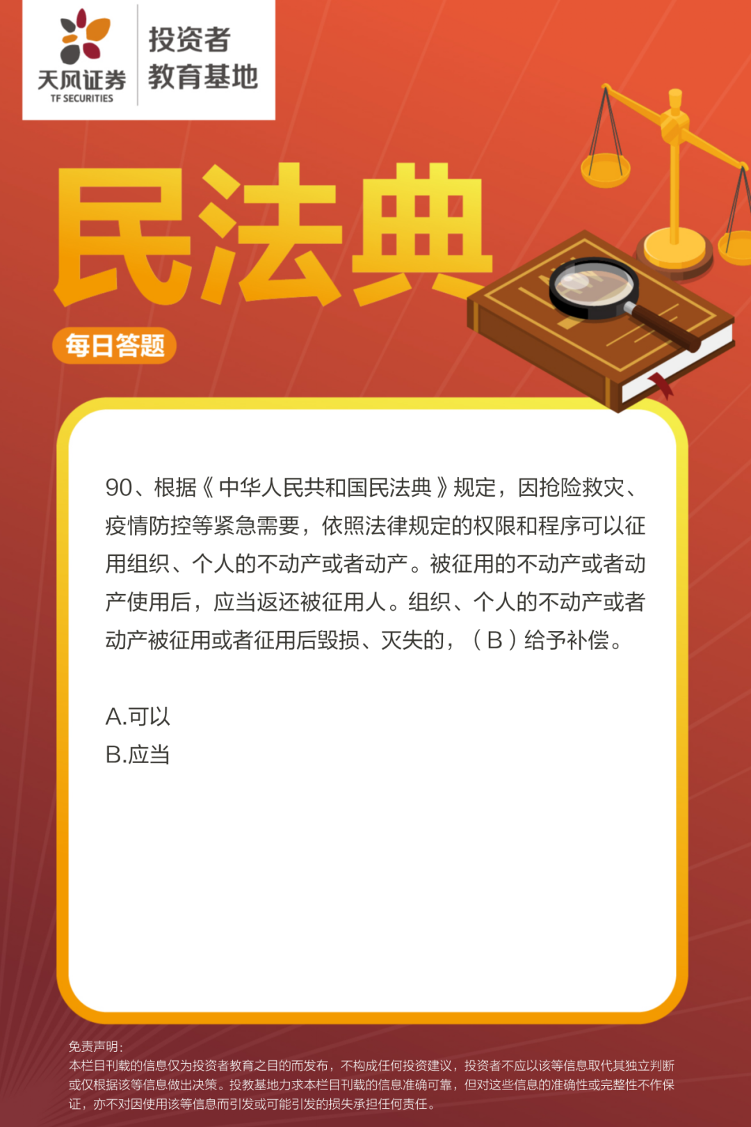 为全面贯彻落实党的二十大和二十届二中全会精神,深入学习宣传贯彻习近平法治思想,引导投资者深入学习民法典,重点宣传平等、自愿、公平、诚信等基本原则,促进经济高质量发展营造良好法治环境,天风证券投教基地特别开展民法典每日答题互动活动,欢迎广大投资者参与。