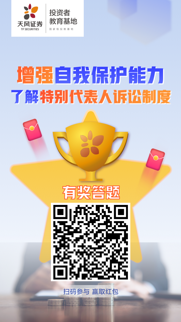 为提升广大投资者法律素养,帮助大家了解证券纠纷特别代表人诉讼制度、特点、原则等方面的知识,天风证券投教基地在2023年1月特别开展“证券纠纷特别代表人诉讼”有奖答题活动,强化投资者风险意识和理性思维,提升其合理运用维权渠道维护自身权益的能力!