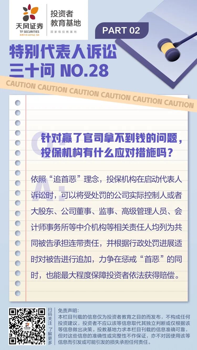 为科普和宣传证券纠纷特别代表人诉讼,天风证券投教基地推出了“特别代表人诉讼三十问”特别专题栏目,将按照投保公司发布的特别代表人诉讼相关概念、知识,每天带您了解一个要点,敬请您关注!