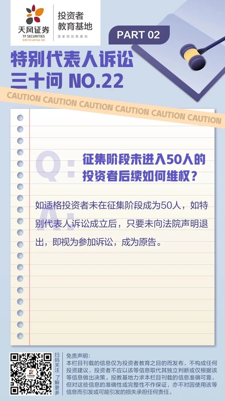 为科普和宣传证券纠纷特别代表人诉讼,天风证券投教基地推出了“特别代表人诉讼三十问”特别专题栏目,将按照投保公司发布的特别代表人诉讼相关概念、知识,每天带您了解一个要点,敬请您关注!