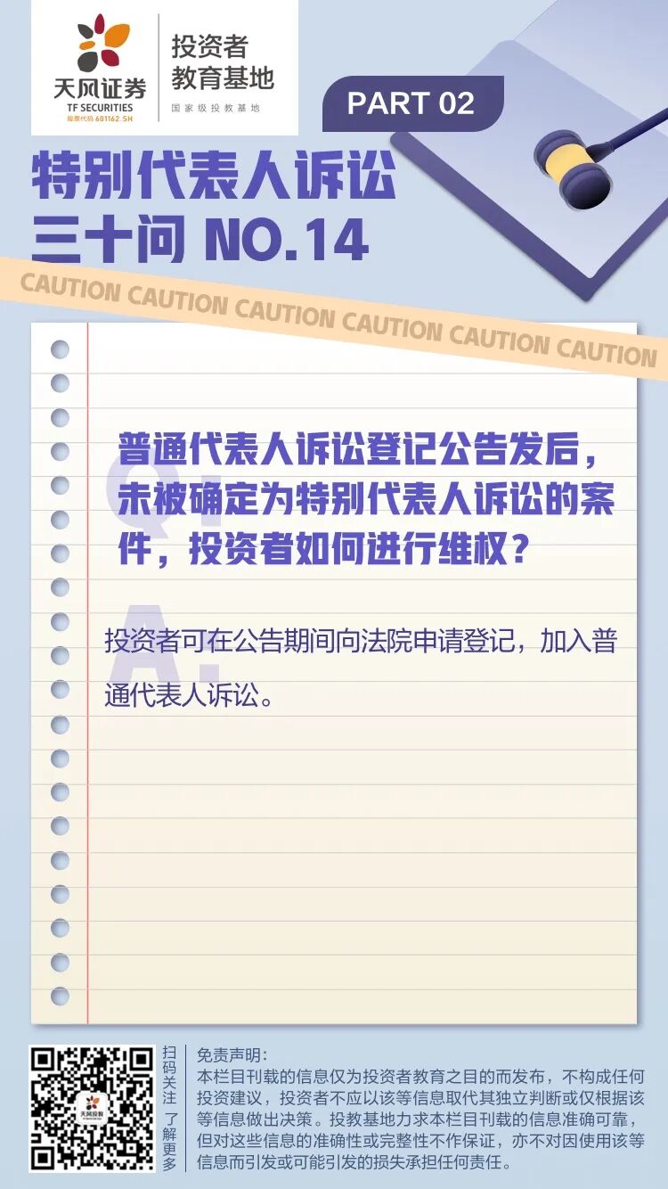 为科普和宣传证券纠纷特别代表人诉讼,天风证券投教基地推出了“特别代表人诉讼三十问”特别专题栏目,将按照投保公司发布的特别代表人诉讼相关概念、知识,每天带您了解一个要点,敬请您关注!