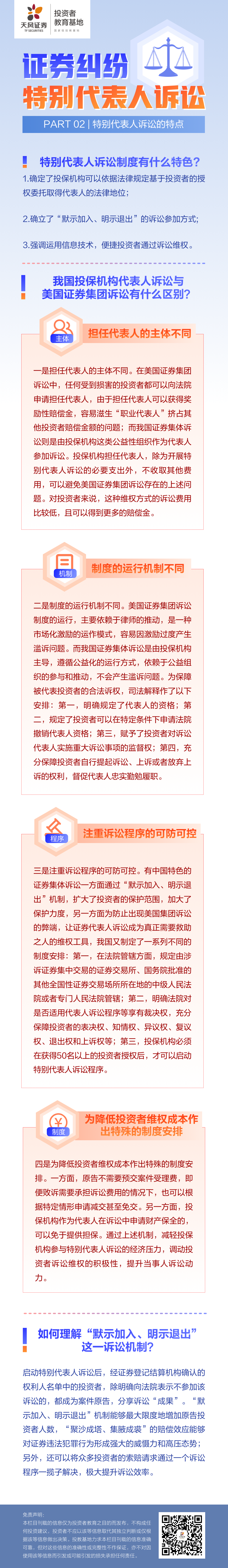 为提升广大投资者法律素养,帮助大家了解证券纠纷特别代表人诉讼制度、特点、原则等方面的知识,天风证券投教基地在2023年1月特别开展“证券纠纷特别代表人诉讼”系列投资者教育活动,敬请关注!